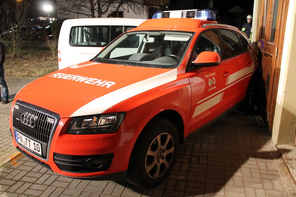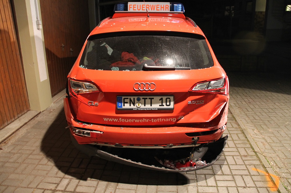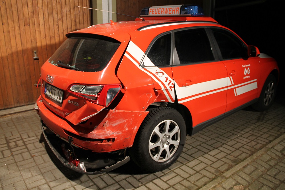 Dabei wurde der Kommandowagen stark beschädigt und befindet sich seitdem im "Status 6", so die Feuerwehrsprache wenn ein Einsatzfahrzeug nicht (mehr) einsatzbereit ist.
