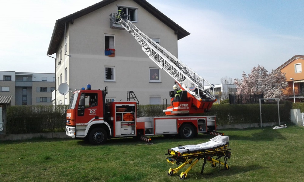 Die Feuerwehr Tettnang wurde mit der Drehleiter zur Überlandhilfe nach Meckenbeuren alarmiert. Eine schwerverletzte Person musste über die Drehleiter mittels Trage liegend gerettet werden. Am Boden wurde die Person dem Rettungsdienst übergeben.