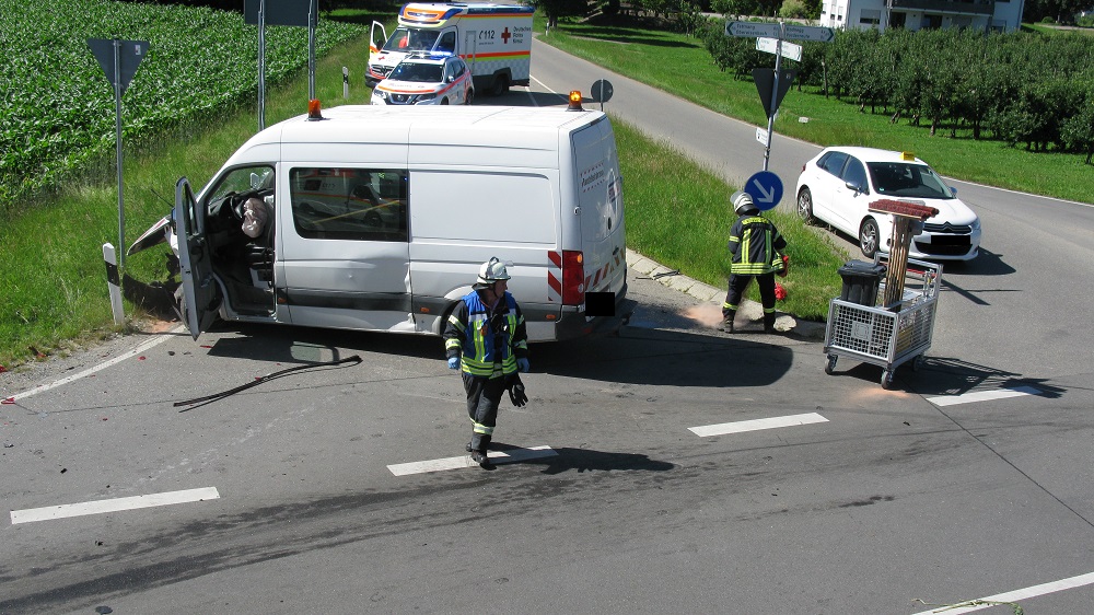 Sechs Personen wurden bei einem Verkehrsunfall zwischen einem PKW und einem Kastenwagen auf der Kreuzung der Bodnegger Straße/Prestenberg verletzt. Die Abteilungen Tannau und Tettnang sicherten die Einsatzstelle ab und stellten den Brandschutz der verunfallten Fahrzeuge sicher.