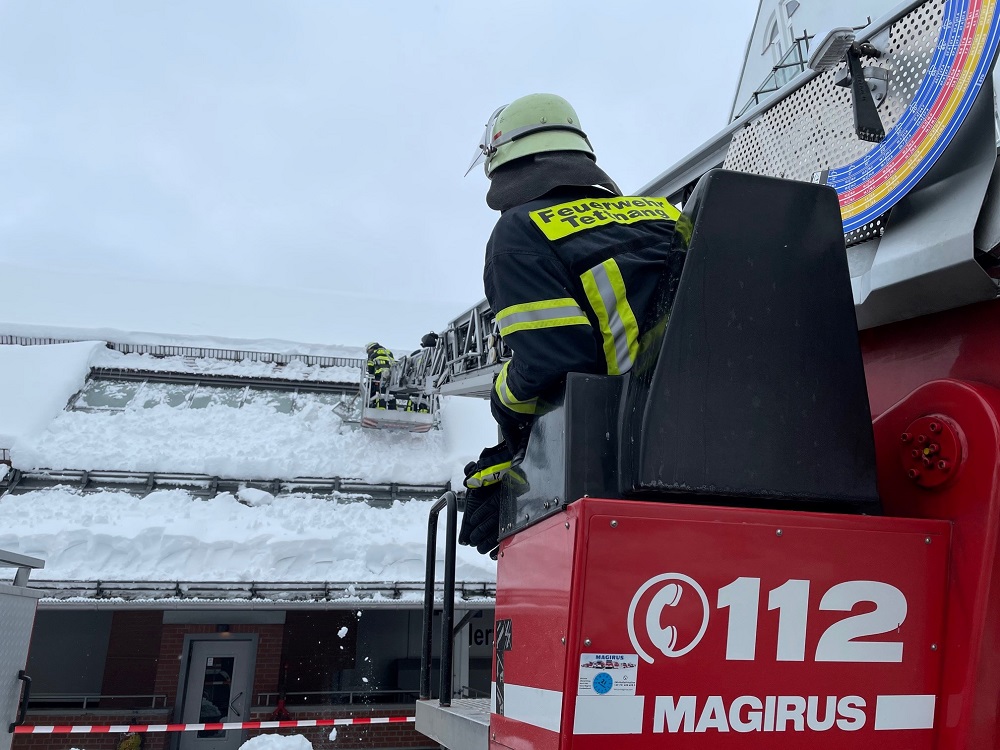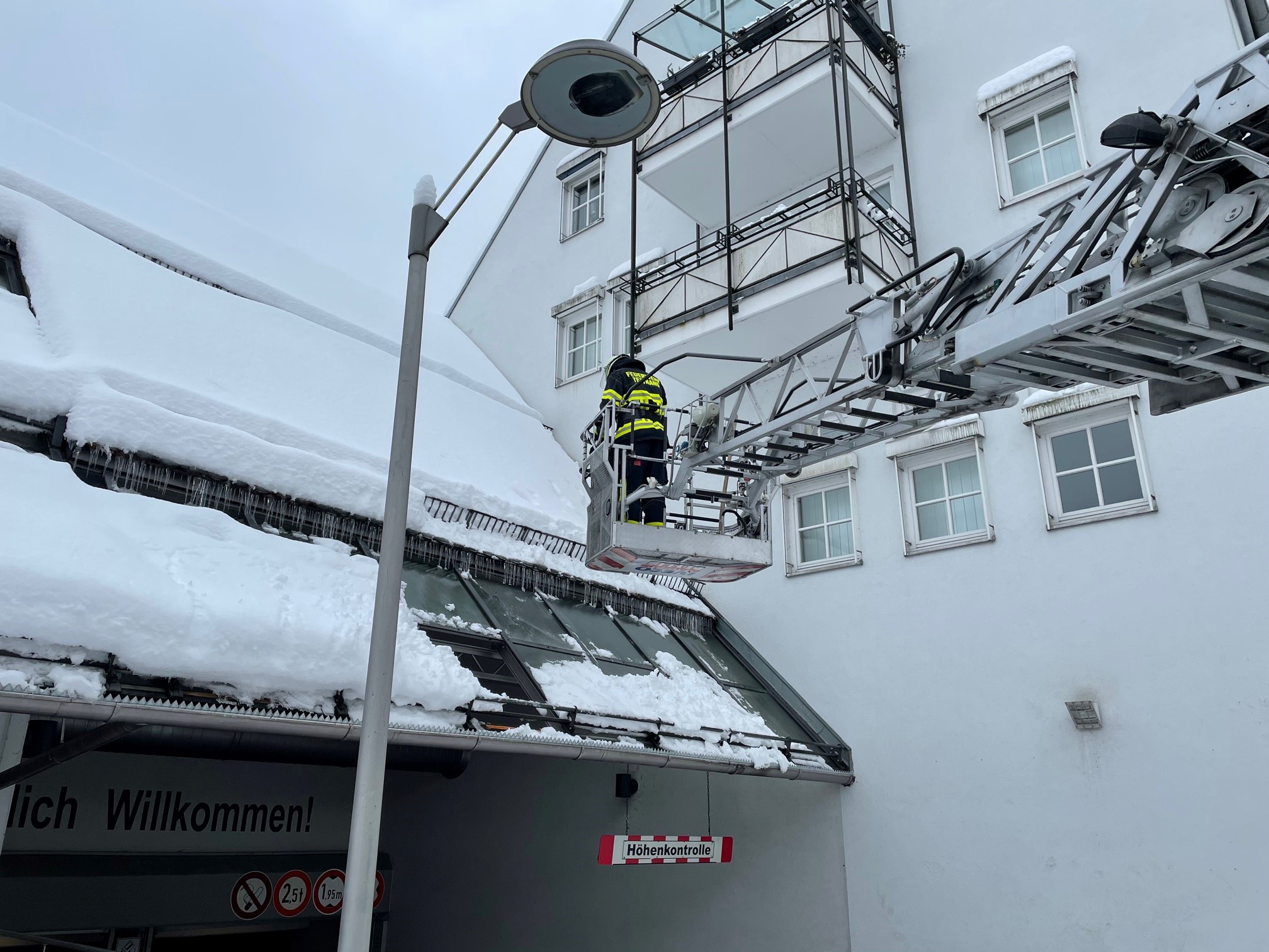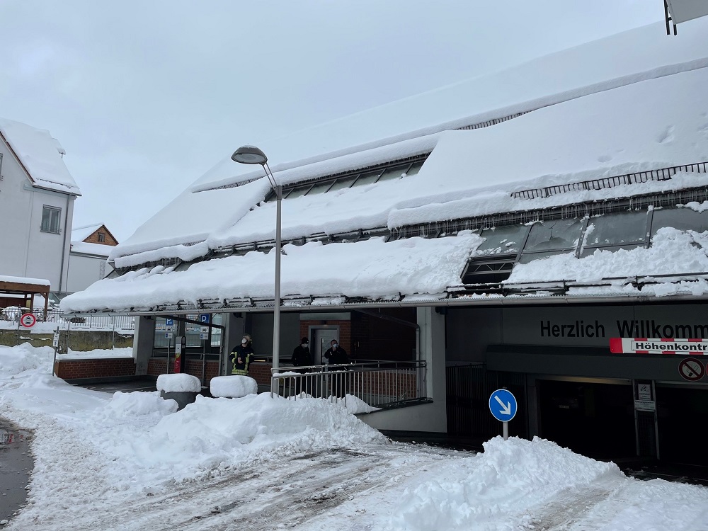 Durch die Schneelast waren die Scheiben einer Glasüberdachung am Parkhaus gebrochen. Die beschädigten Scheiben wurden entfernt und der Schnee von den übrigen Glasflächen entfernt.
