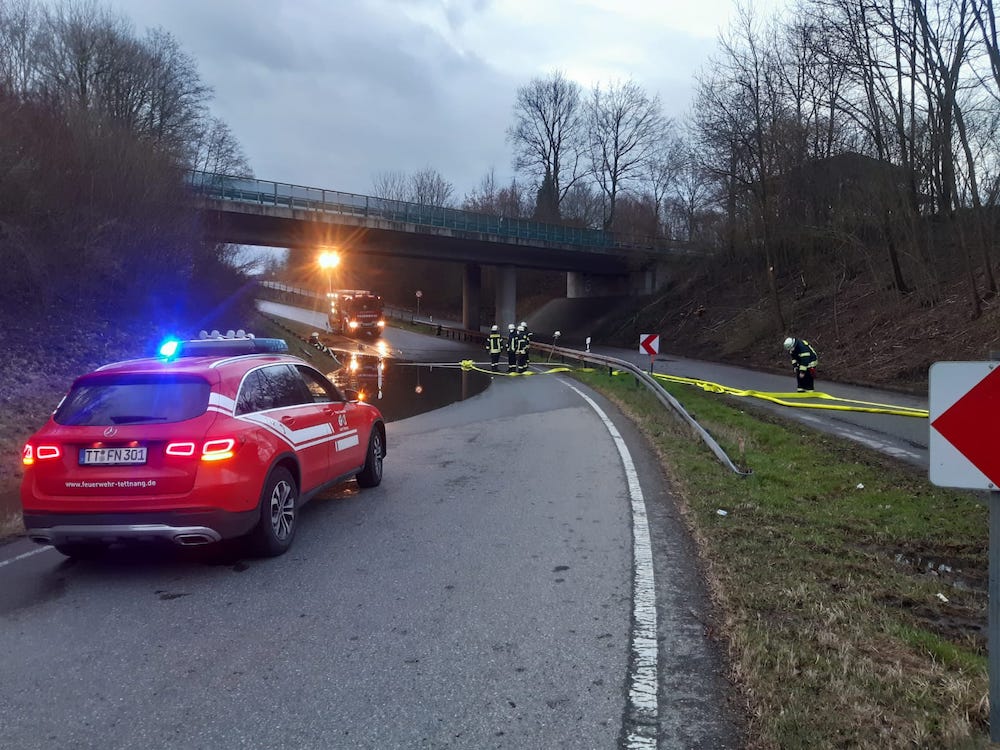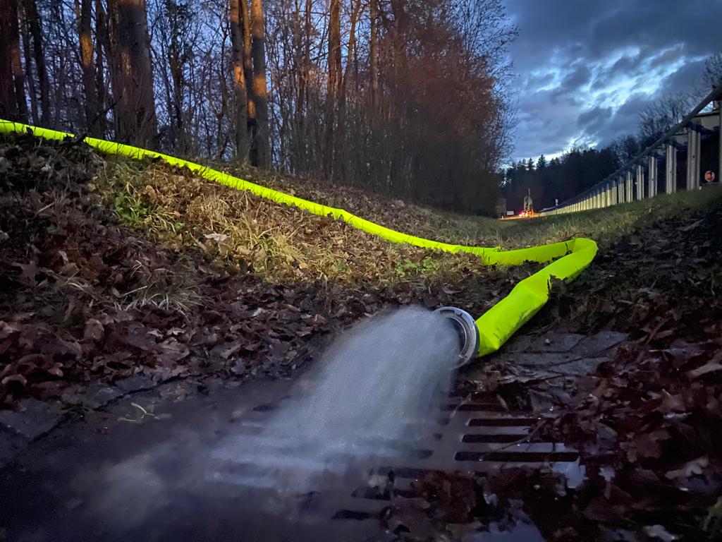 In der Senke der Abfahrt der B 467 sammelte sich eine größere Menge Wasser an. Das Wasser wurde abgepumpt und die Straßenmeisterei angefordert um die Ursache zu beheben.