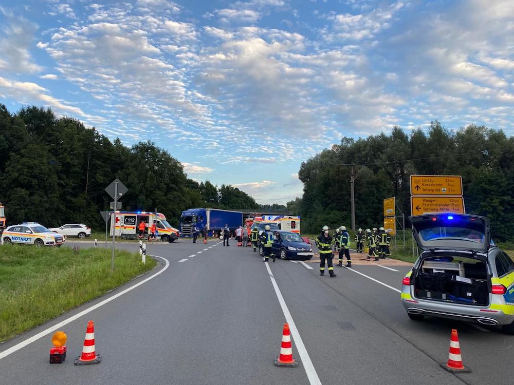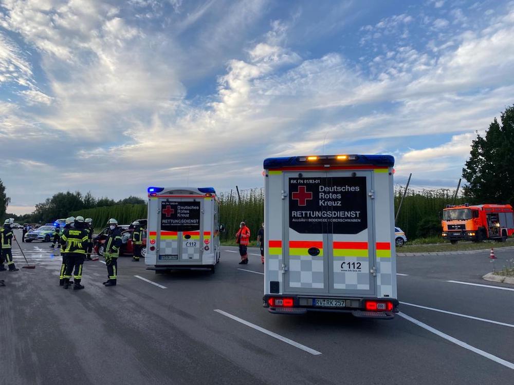 Gegen 19:46 Uhr wurde die Freiwillige Feuerwehr Tettnang zu einem Verkehrsunfall auf der B 467 Abfahrt Bürgermoos alarmiert. Glücklicherweise war niemand der insgesamt sieben Insassen eingeklemmt, sodass die Feuerwehr die Einsatzstelle absicherte und Betriebsmittel aufnahm.