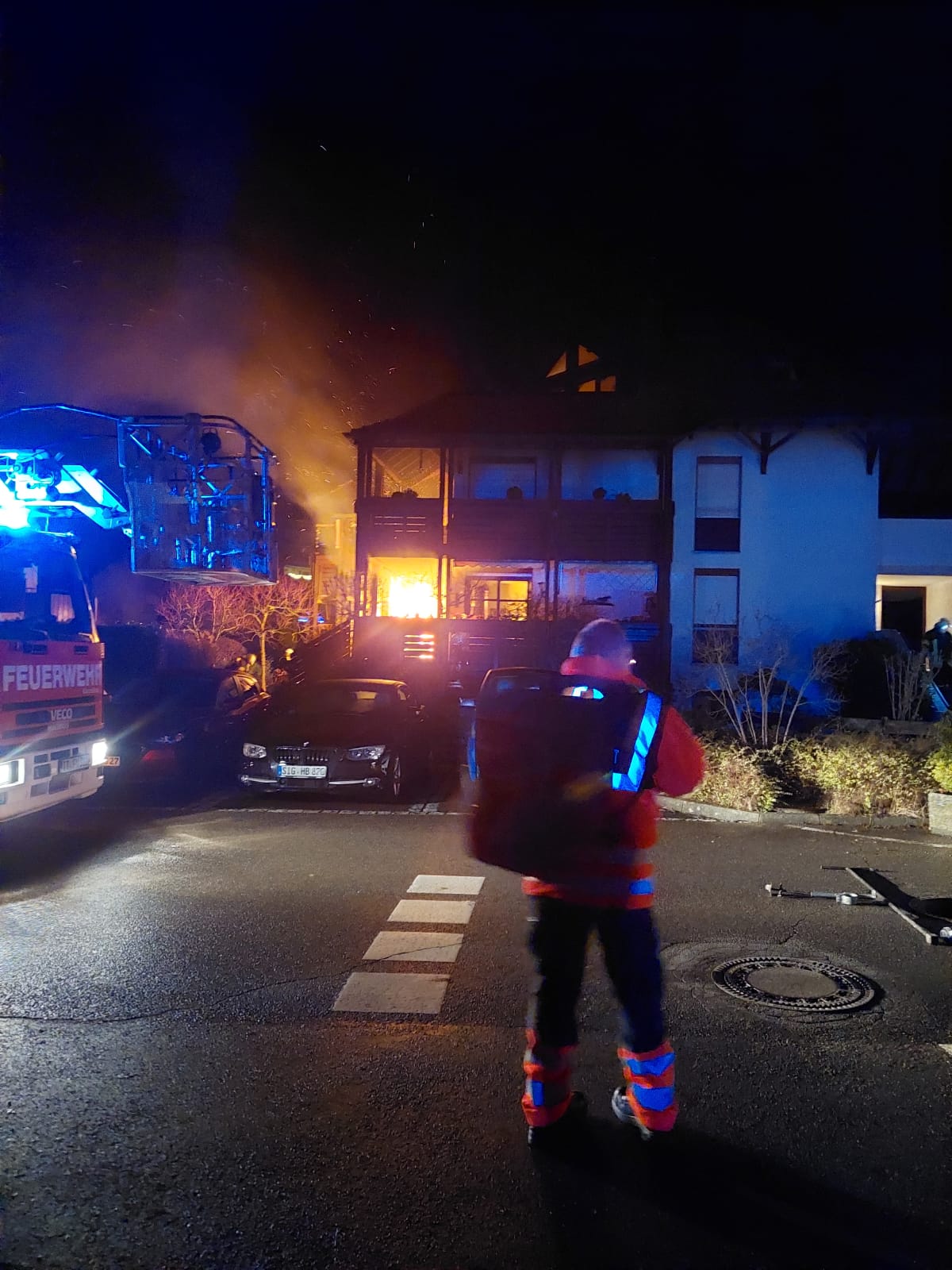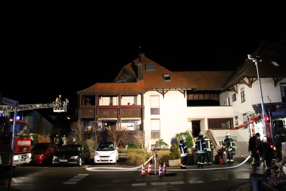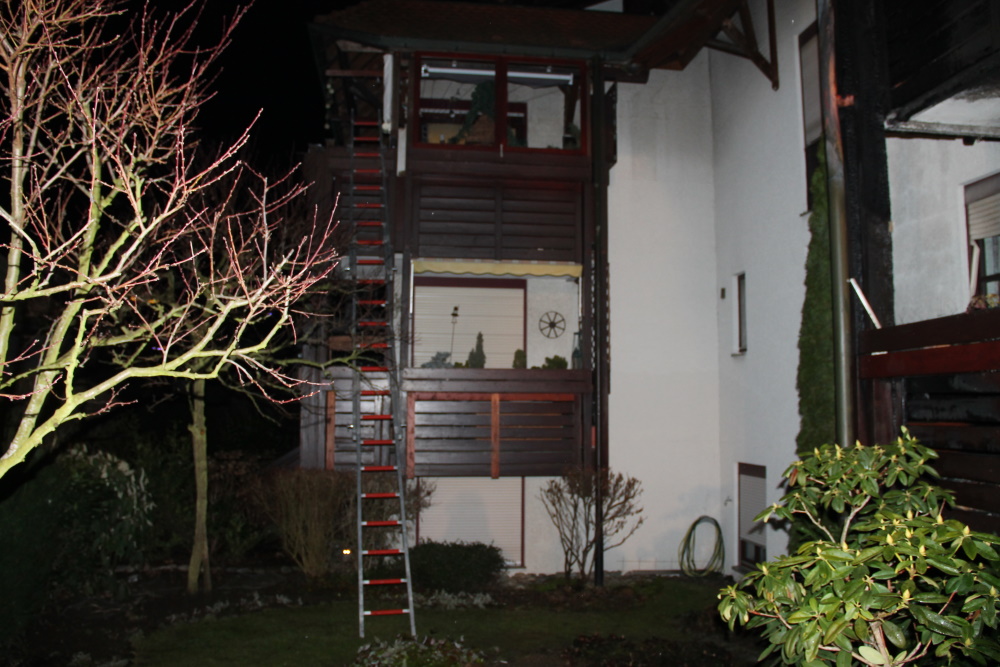 Als die Feuerwehr vor Ort eintraf, befand sich der Holzbalkon im Erdgeschoss des Mehrfamilienhauses in Vollbrand, eine Person stand dabei auf dem Balkon im 1. Obergeschoss des angewinkelten Gebäudeteils im Brandrauch. Die Anwohner im Erdgeschoss hatten erste Löschversuche unternommen. Durch die starken Flammen hatte sich der Brand bereits bis auf den Balkon im 2. Obergeschoss ausgebreitet.
