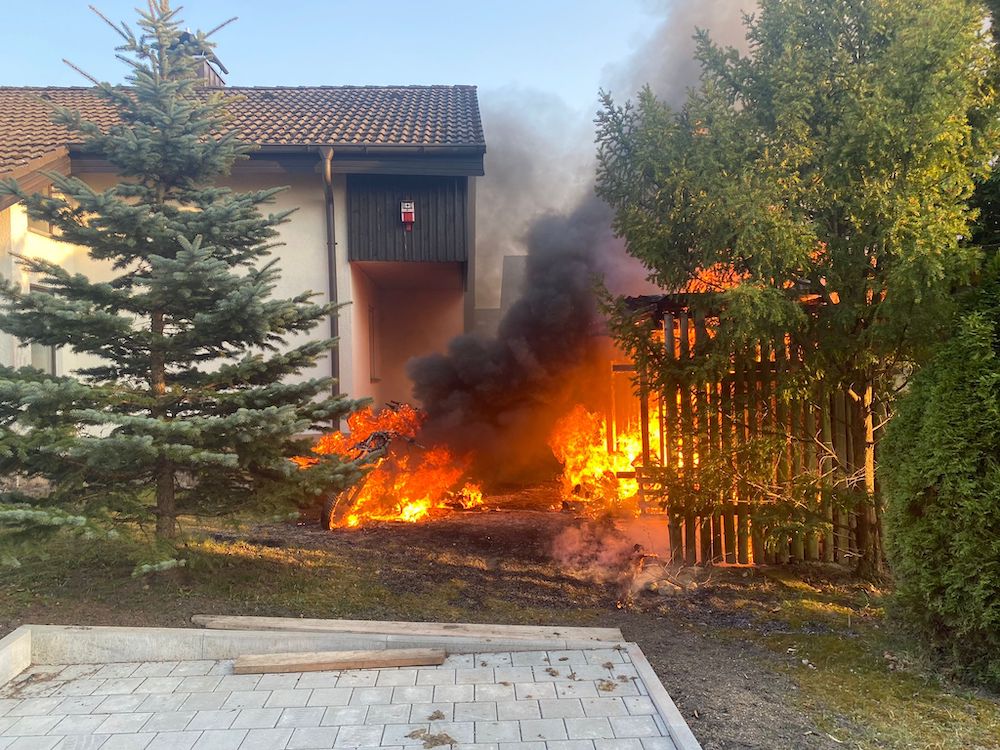 Unter dem Stichwort "F1 - Brennt Motorrad" wurde die Tettnanger Feuerwehr am Samstagabend in den Schäferhof alarmiert. Beim Eintreffen der ersten Kräfte war schnell klar, dass nicht nur das Motorrad, welches in unmittelbarer Nähe zu einem Wohnhaus stand brannte, sondern auch bereits ein daneben stehender Holzstapel sowie in Teilen eine benachbarte Garage.