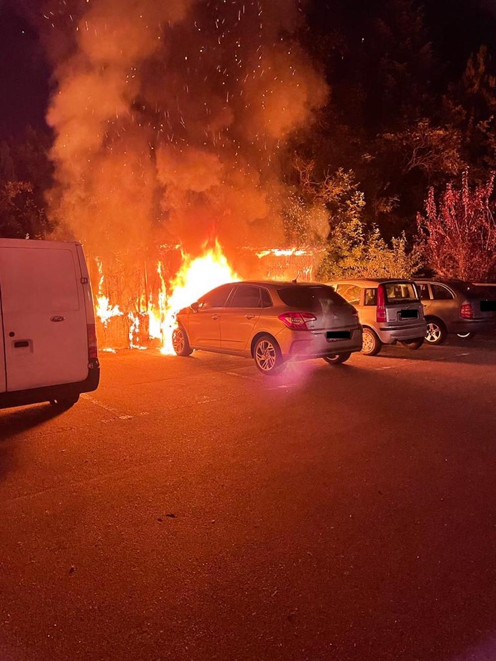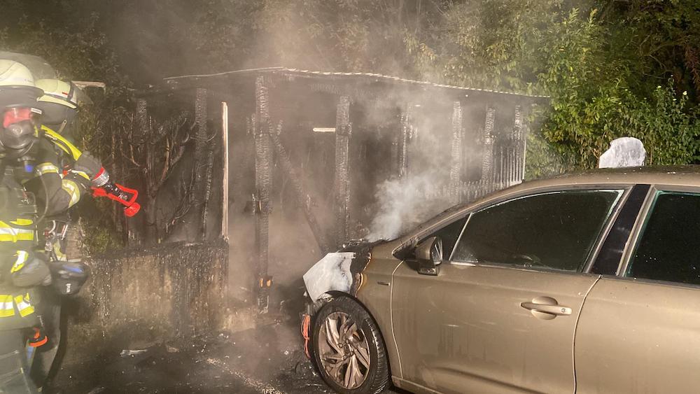 F2 - Brennt Mülltonnenunterstand, Übergriff auf danebenstehende PKW