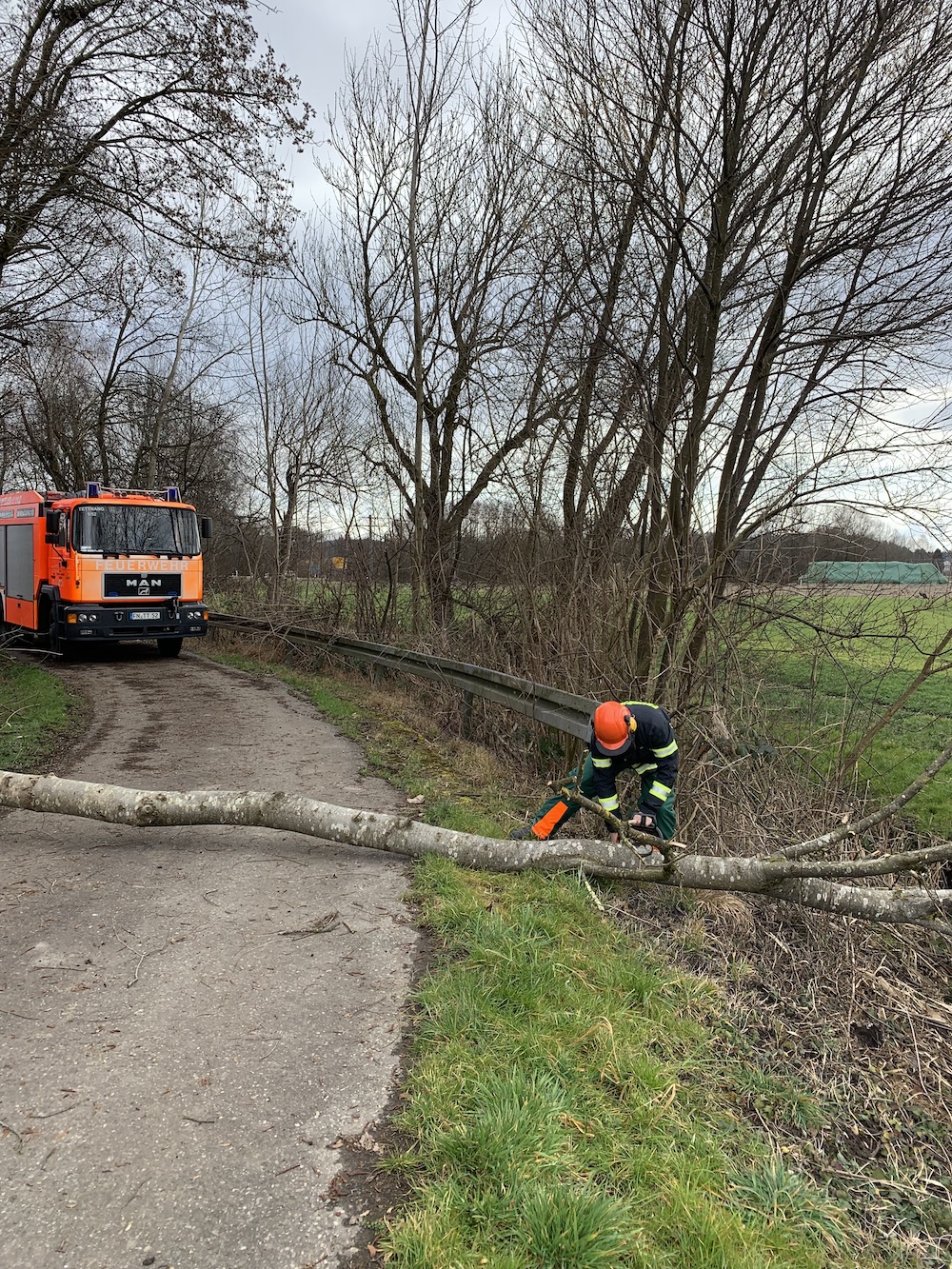 Ein auf der Straße liegender Baum musste durch die Feuerwehr zersägt werden.