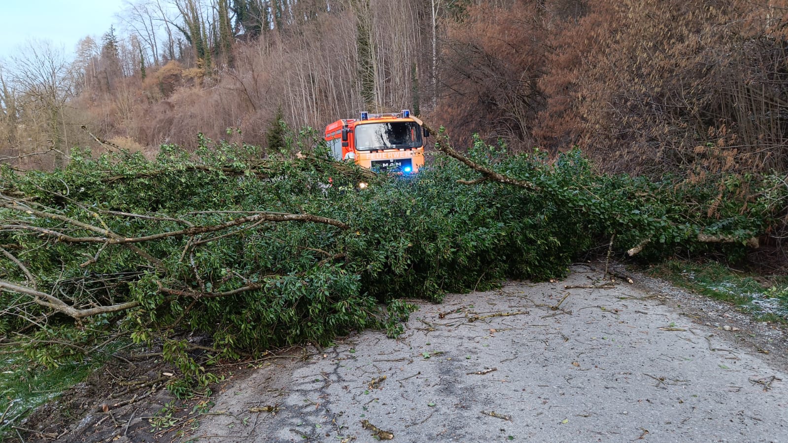 Ein großer, auf der Straße liegender Baum musste durch die Feuerwehr zersägt werden. Anschließend wurde die gesperrte Fahrbahn wieder freigegeben.