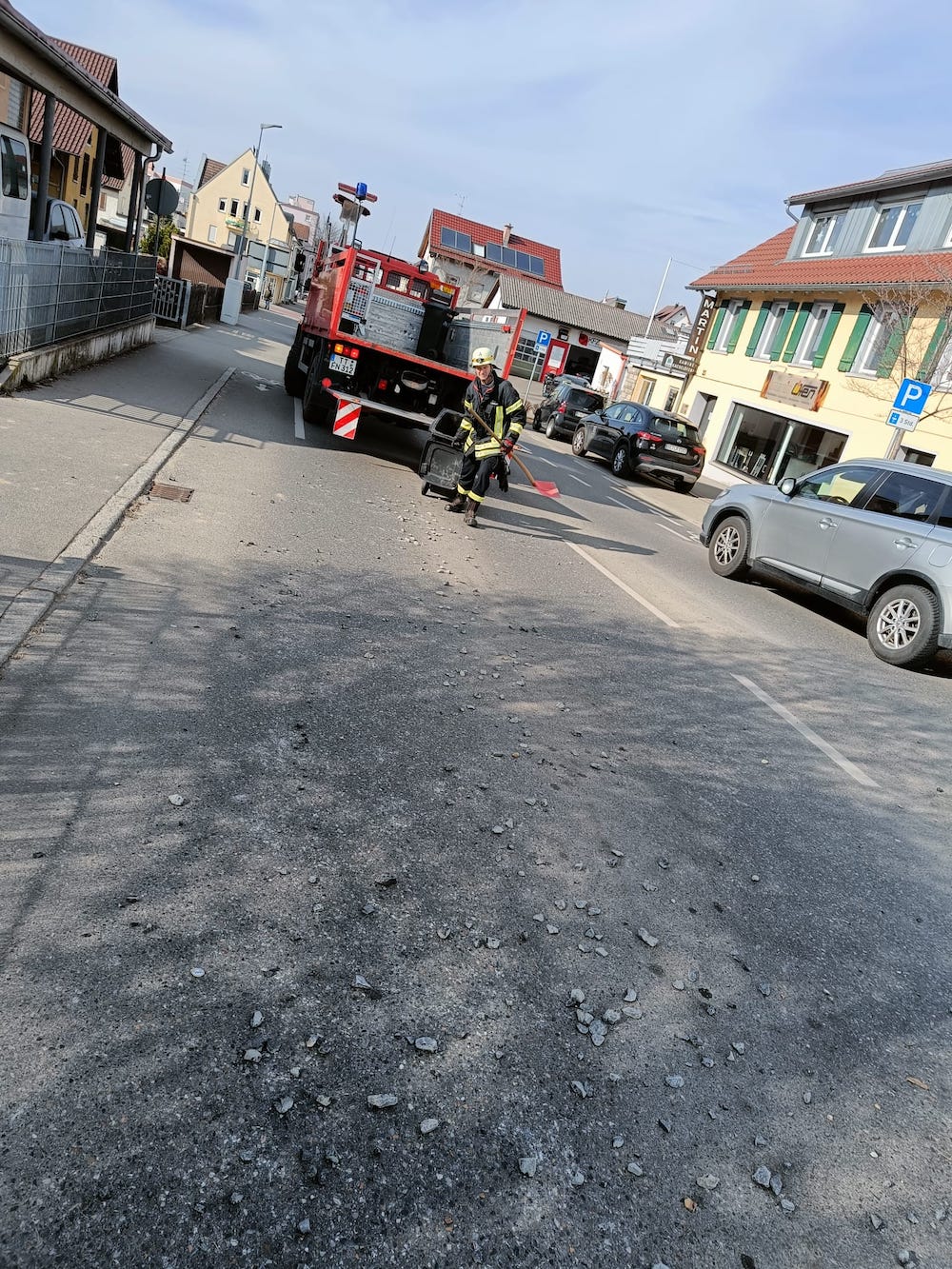 In der Innenstadt kam es zu einer weitläufigen Verunreinigung der Straße mit Kies. Das Kies wurde aufgenommen und die Straße an die Polizei übergeben.