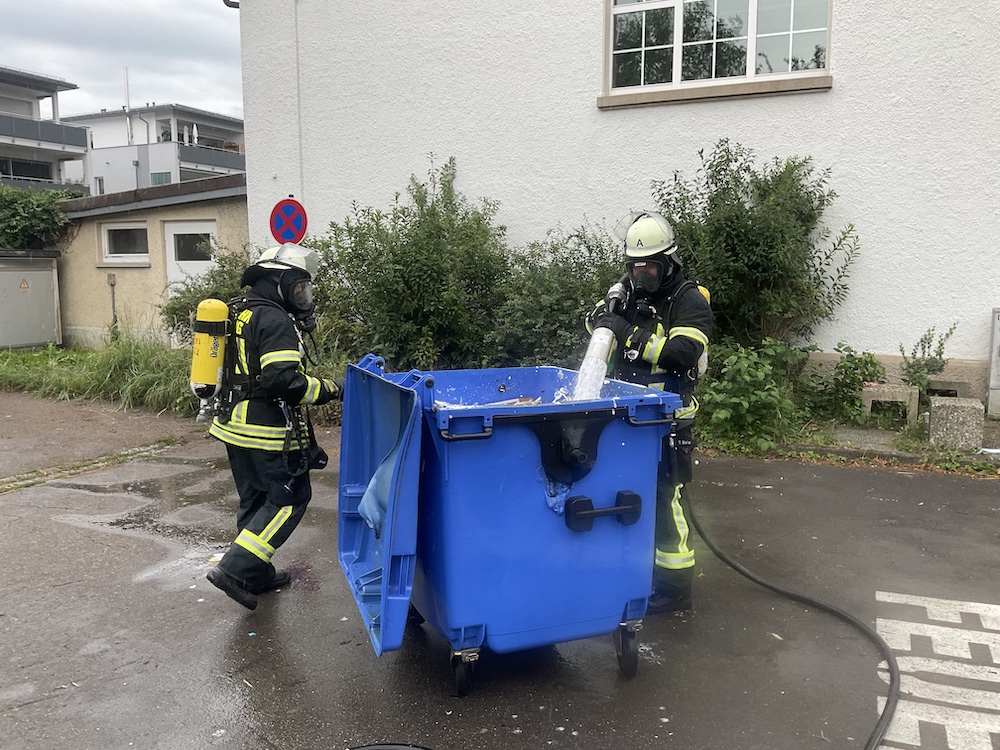 Passanten alarmierten die Feuerwehr wegen einem brennenden Papiercontainer. Das Feuer konnte mit dem Schnellangriff unter Atemschutz rasch gelöscht werden.