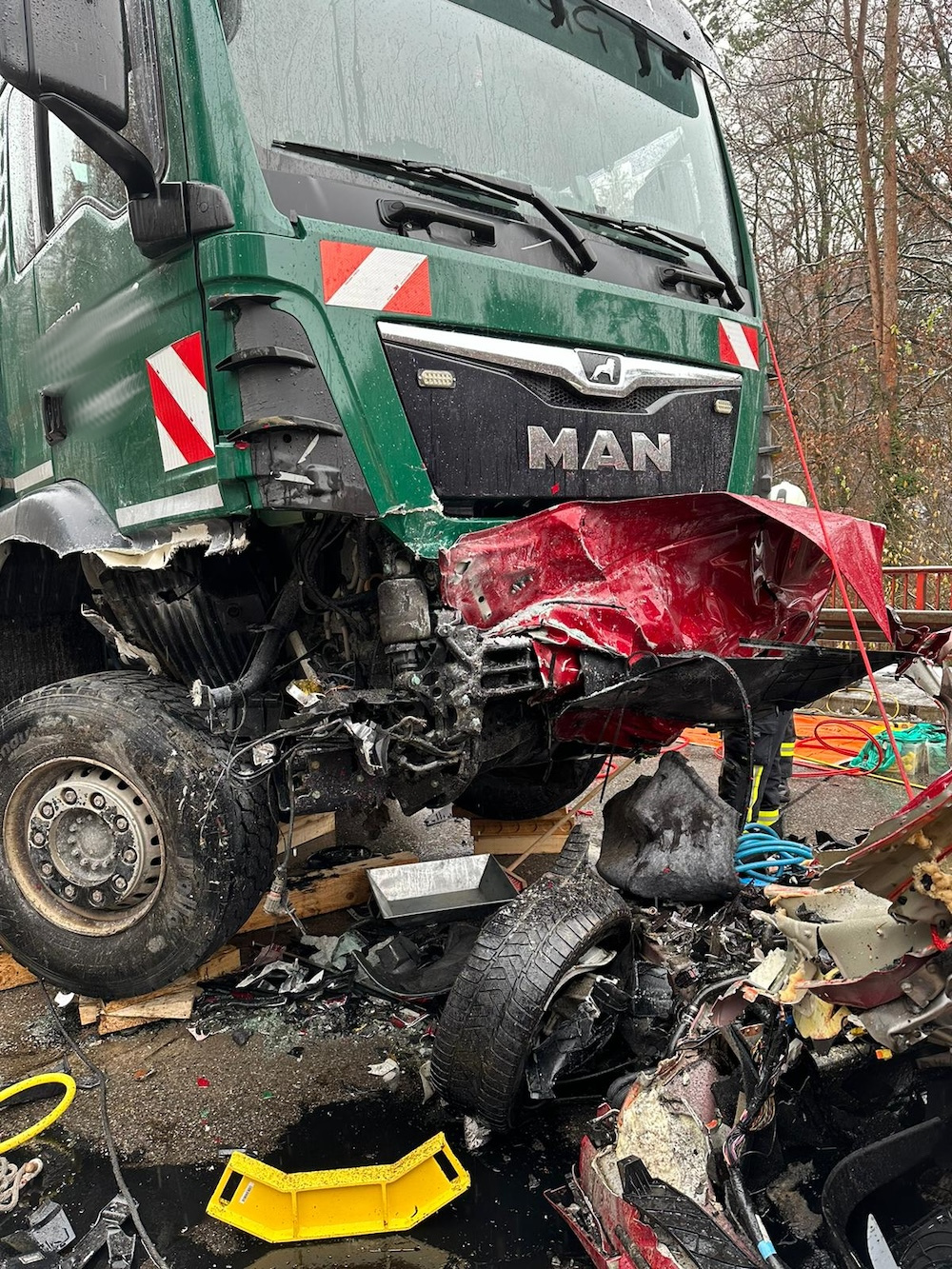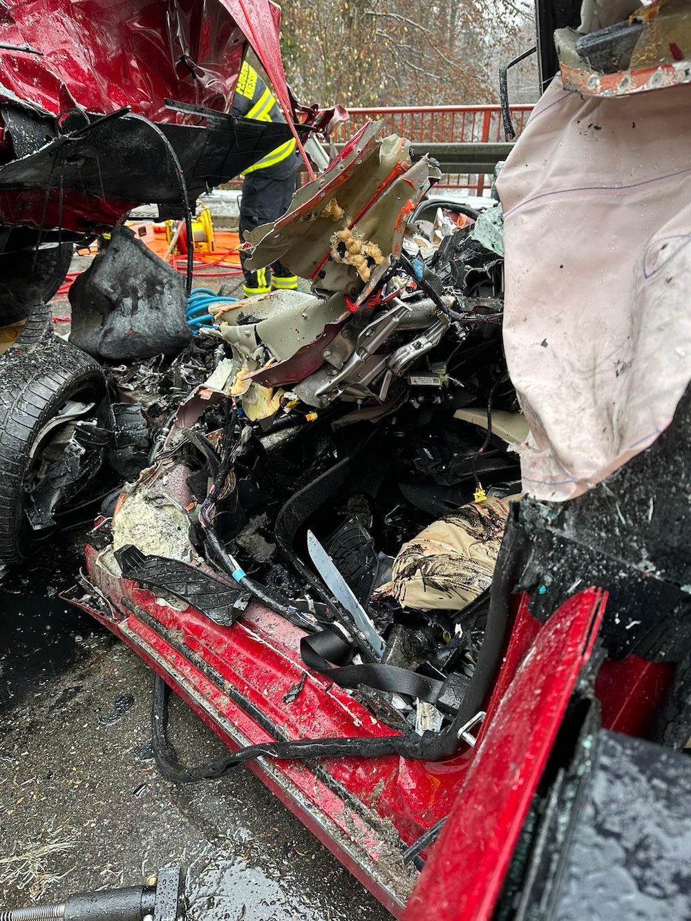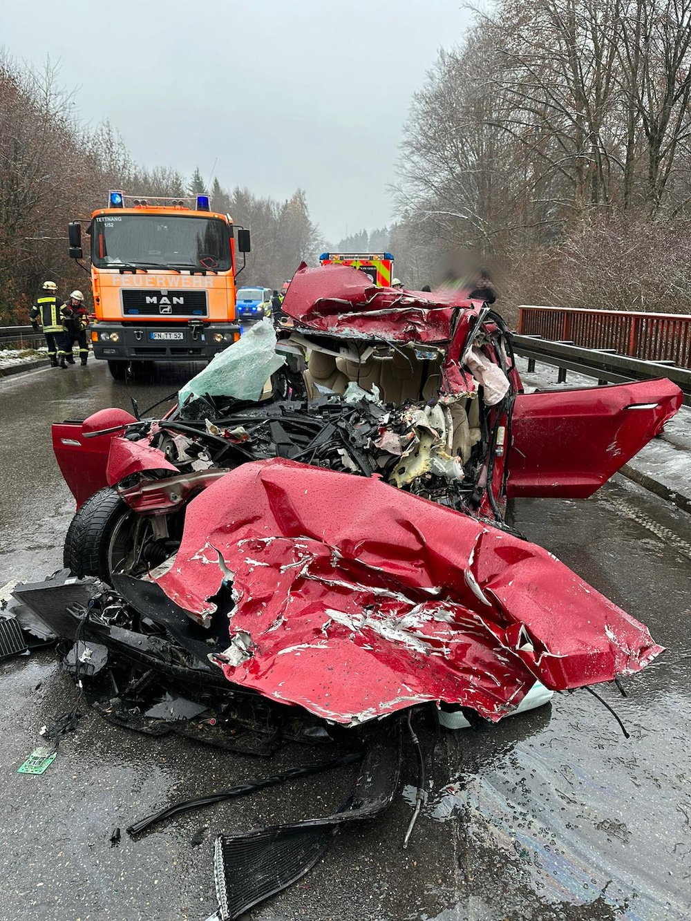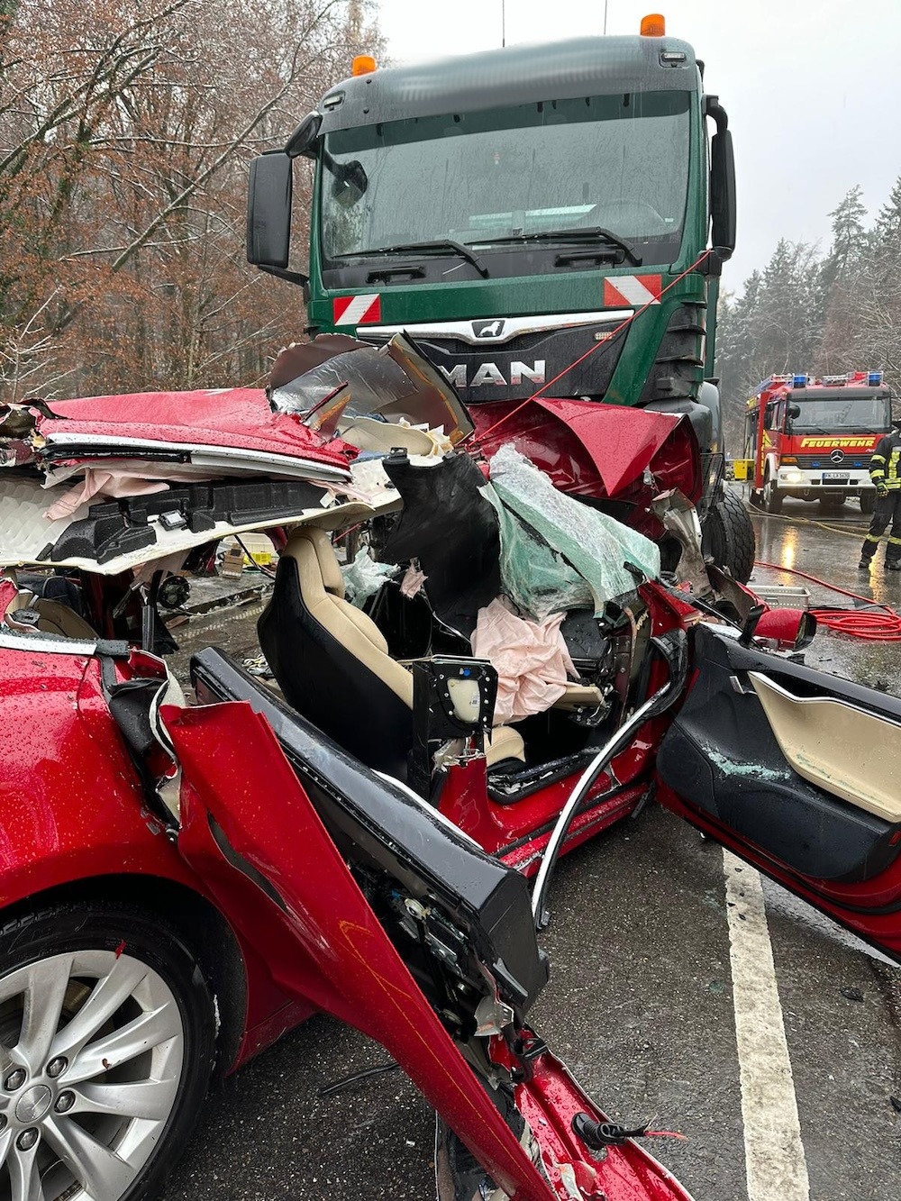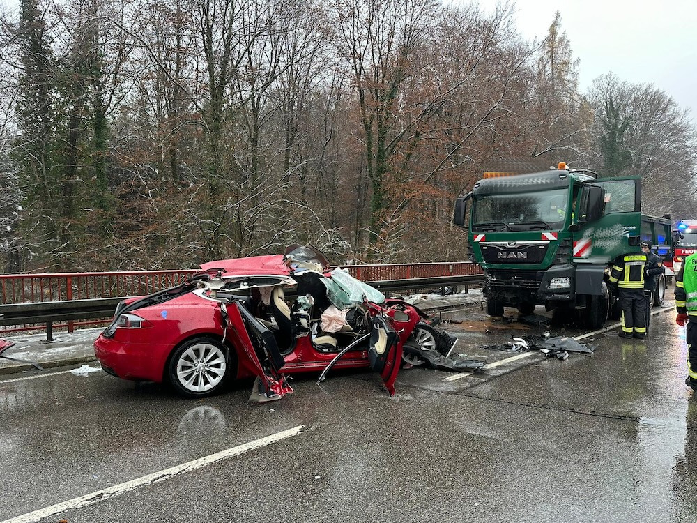 Als die Einsatzkräfte der Feuerwehren Kressbronn, Langenargen und Tettnang eintrafen zeigte sich, dass der PKW zu zwei dritteln unter dem LKW verkeilt war. Dabei gestaltete sich die Rettung des Tesla-Fahrers äußert erschwert. Um den Fahrer befreien zu können musste der voll beladene LKW mittels technischem Gerät angehoben werden. Anschließend wurde der Fahrer des PKW durch die Feuerwehren in einer gemeinschaftlichen Rettung mit hydraulischem Rettungsgerät und weiteren technischen Mitteln aus seinem völlig deformierten Tesla befreit.