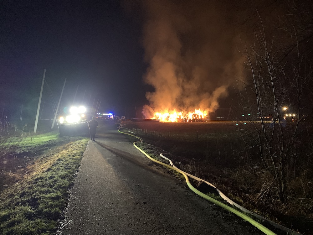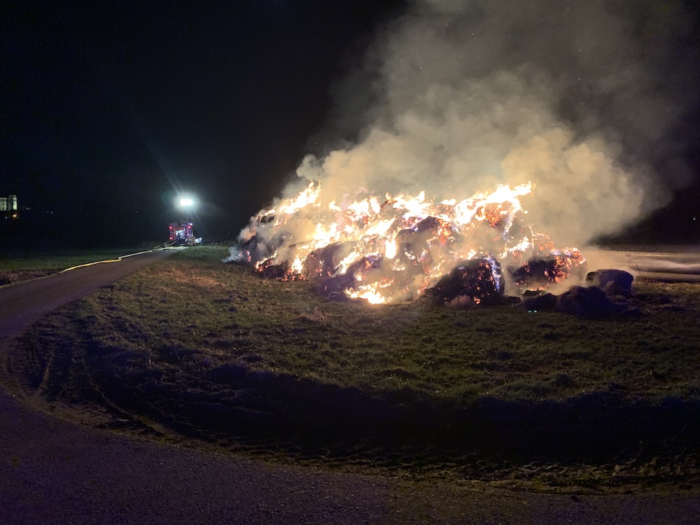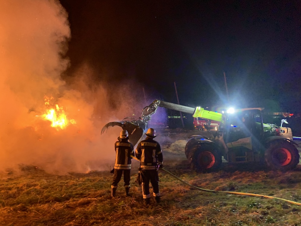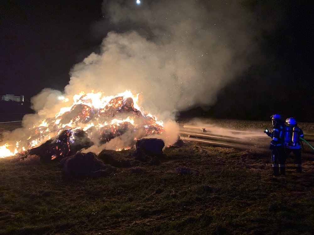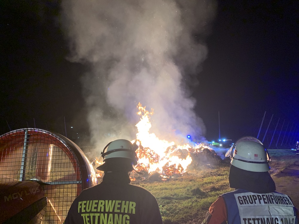 Gegen 20:43 Uhr alarmierte die Leitstelle Bodensee-Oberschwaben am Samstagabend die Freiwillige Feuerwehr Tettnang mit dem Stichwort „Feuer1 – Brennende Strohballen“ nach Tettnang-Bürgermoos.