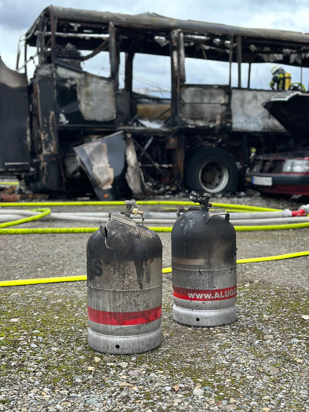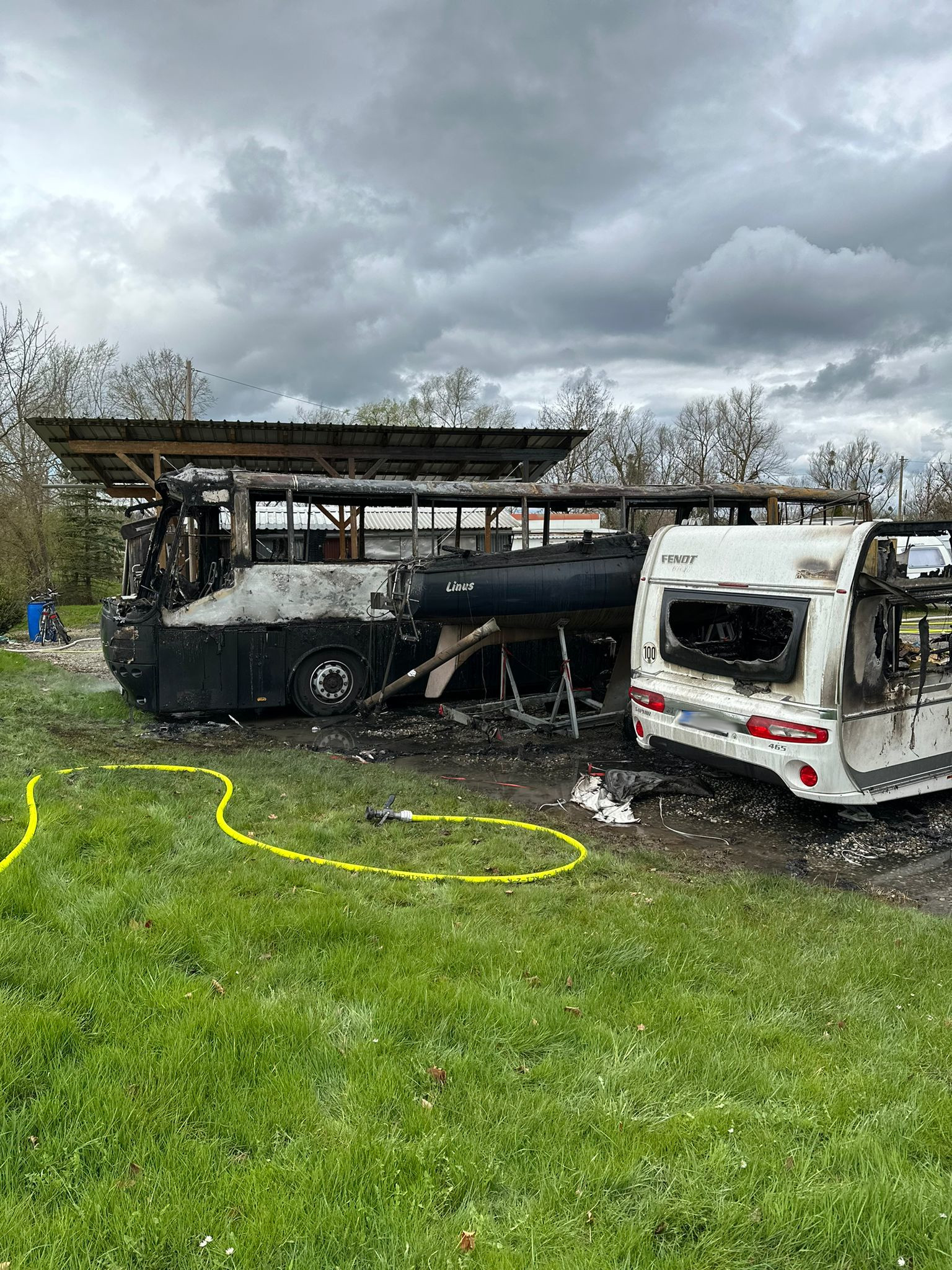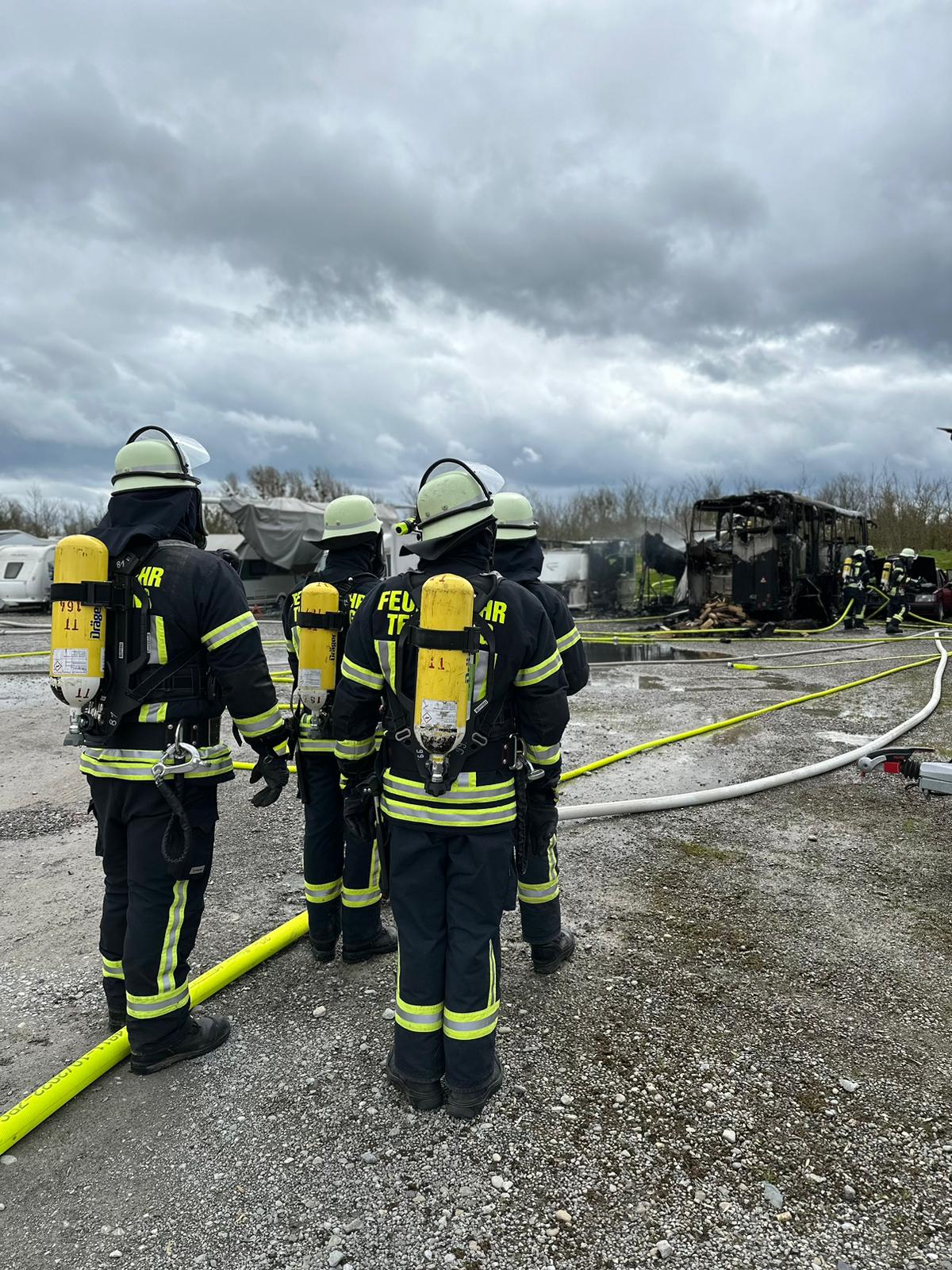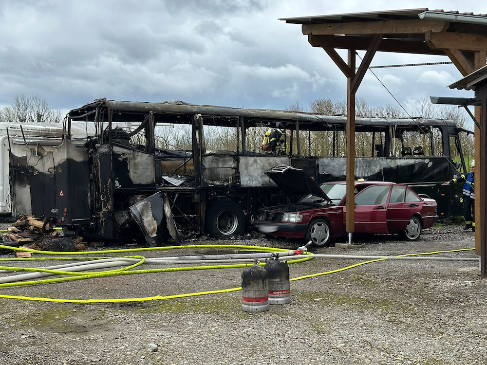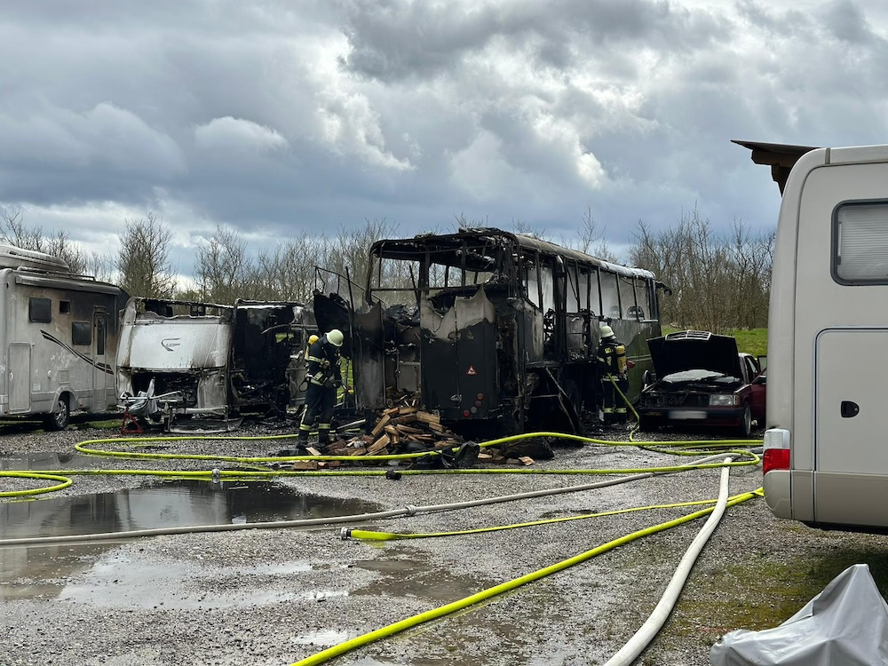 Auf einem Wohnmobilstellplatz war nach ersten Erkenntnissen ein dort abgestellter Reisebus in Brand geraten. Durch die Wärmestrahlung brannte ein ebenfalls dort abgestelltes Boot, ein Wohnwagen. Ein weiteres Wohnmobil wurde in Mitleidenschaft gezogen.
