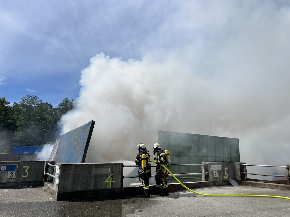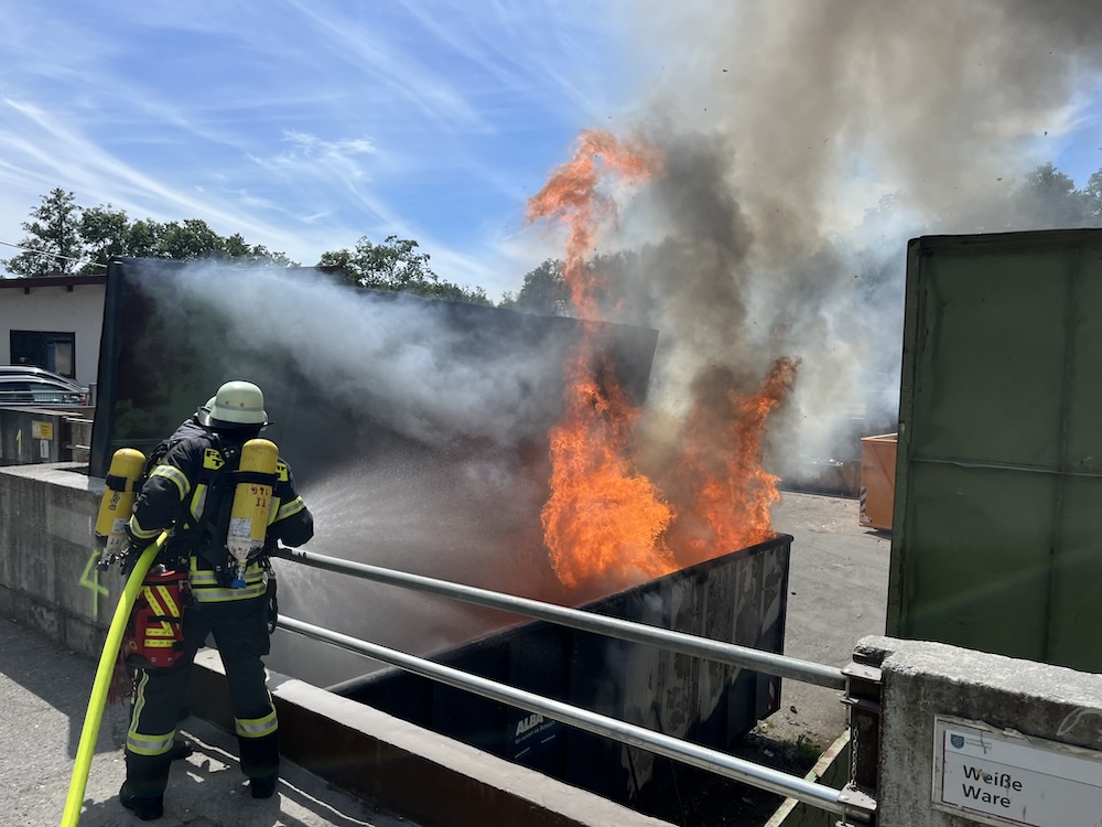 Vor Ort wurde nach der Erkundung durch die Einsatzkräfte mitunter aufgrund der Brandausdehnung des 40 Kubikmeter-Containres und der weiteren Brandlast in der direkten Umgebung und auf Feuer 2 erhöht.