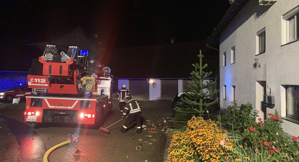 Ein Blitzeinschlag führte zu der Alarmierung der Freiwilligen Feuerwehr Tettnang von den Abteilungen Tannau und Tettnang. Anwohner meldeten, dass der Blitz in den Kamin des Wohnhauses eingschlagen war. Beim Eintreffen der Einsatzkräfte lagen Teile des Kamins auf dem Boden vor dem Wohnhaus.