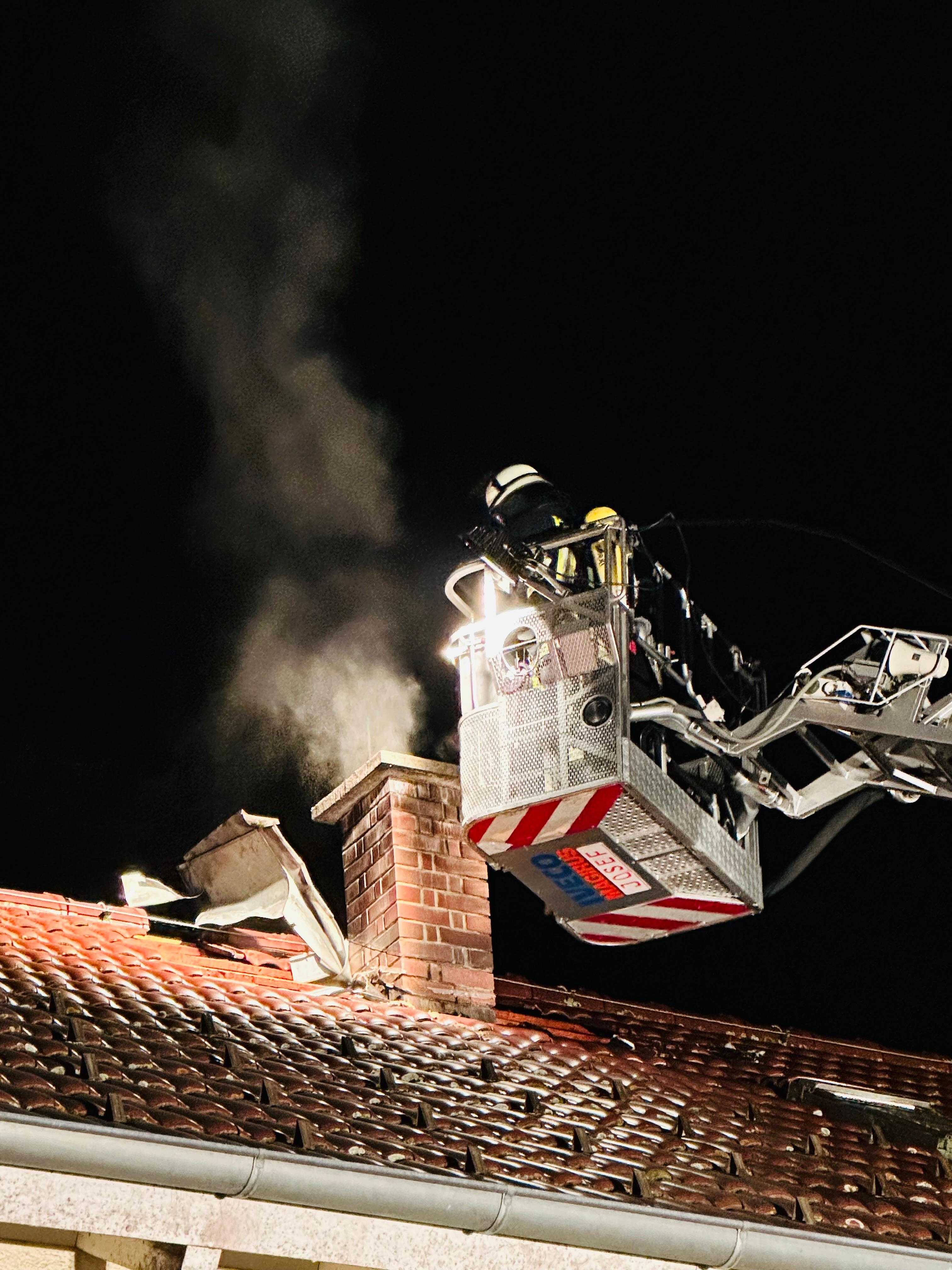 Umgehend wurde die Drehleiter in Stellung gebracht, während Trupps unter Atemschutz die verschiedenen Geschosse mit der Wärmebildkamera kontrollieren. Parallel wurde ein Schornsteinfeger zur Einsatzstelle alarmiert. Da Brandrauch zwischen den Dachziegeln austrat und auch im Obergeschoss eine leichte Verrauchung vorhanden war, waren umfangreiche Erkundungsmaßnahmen notwendig.