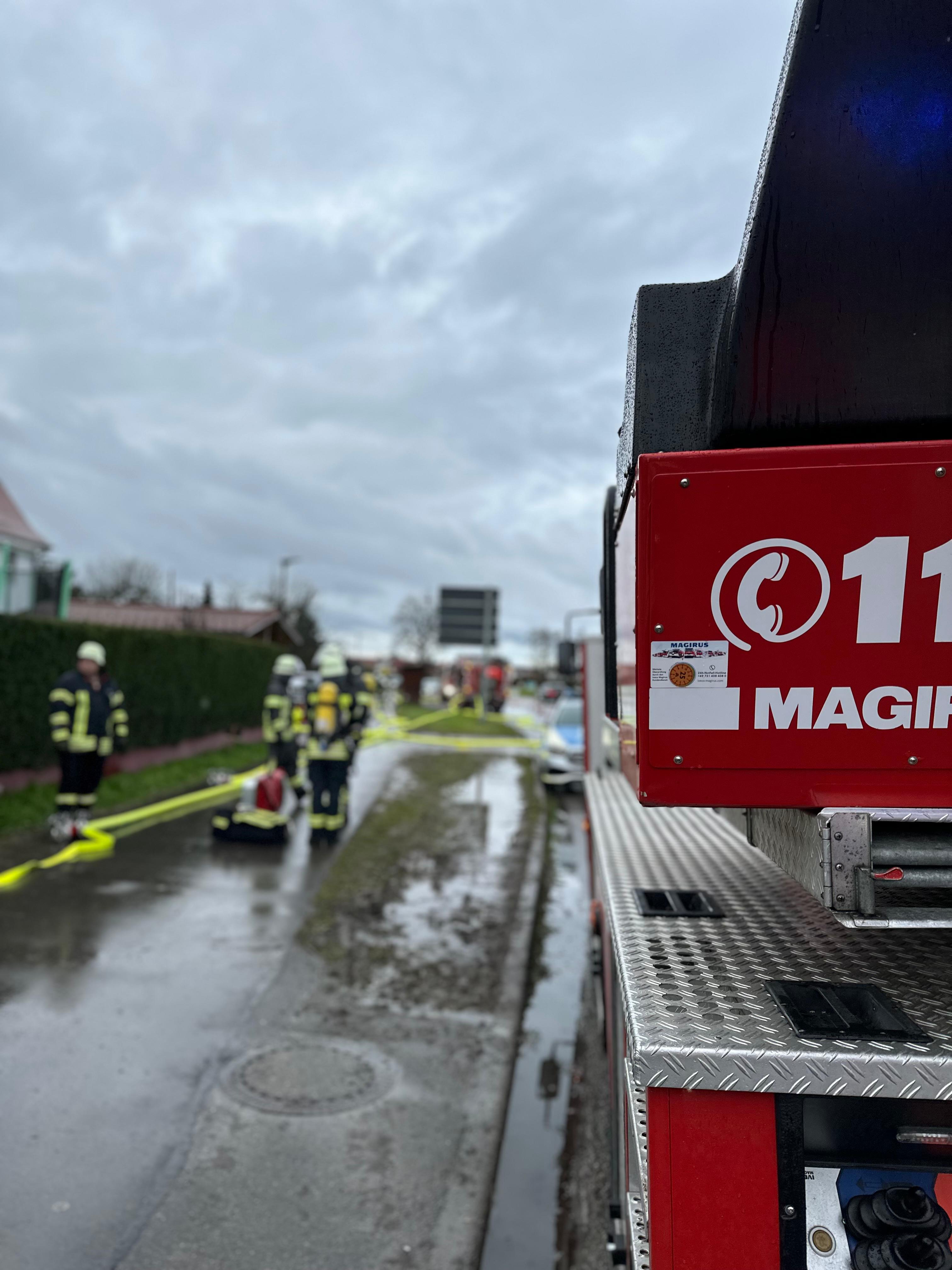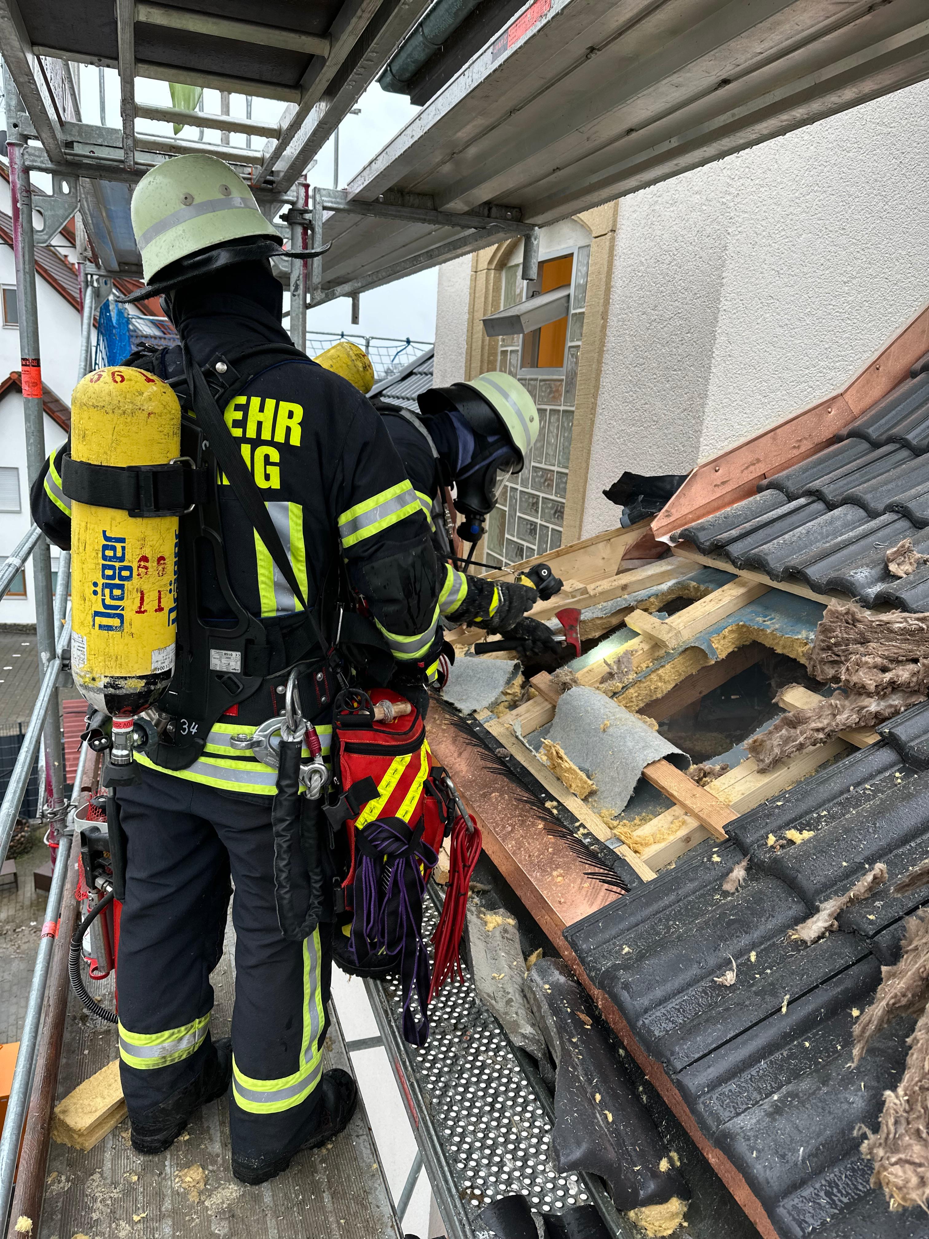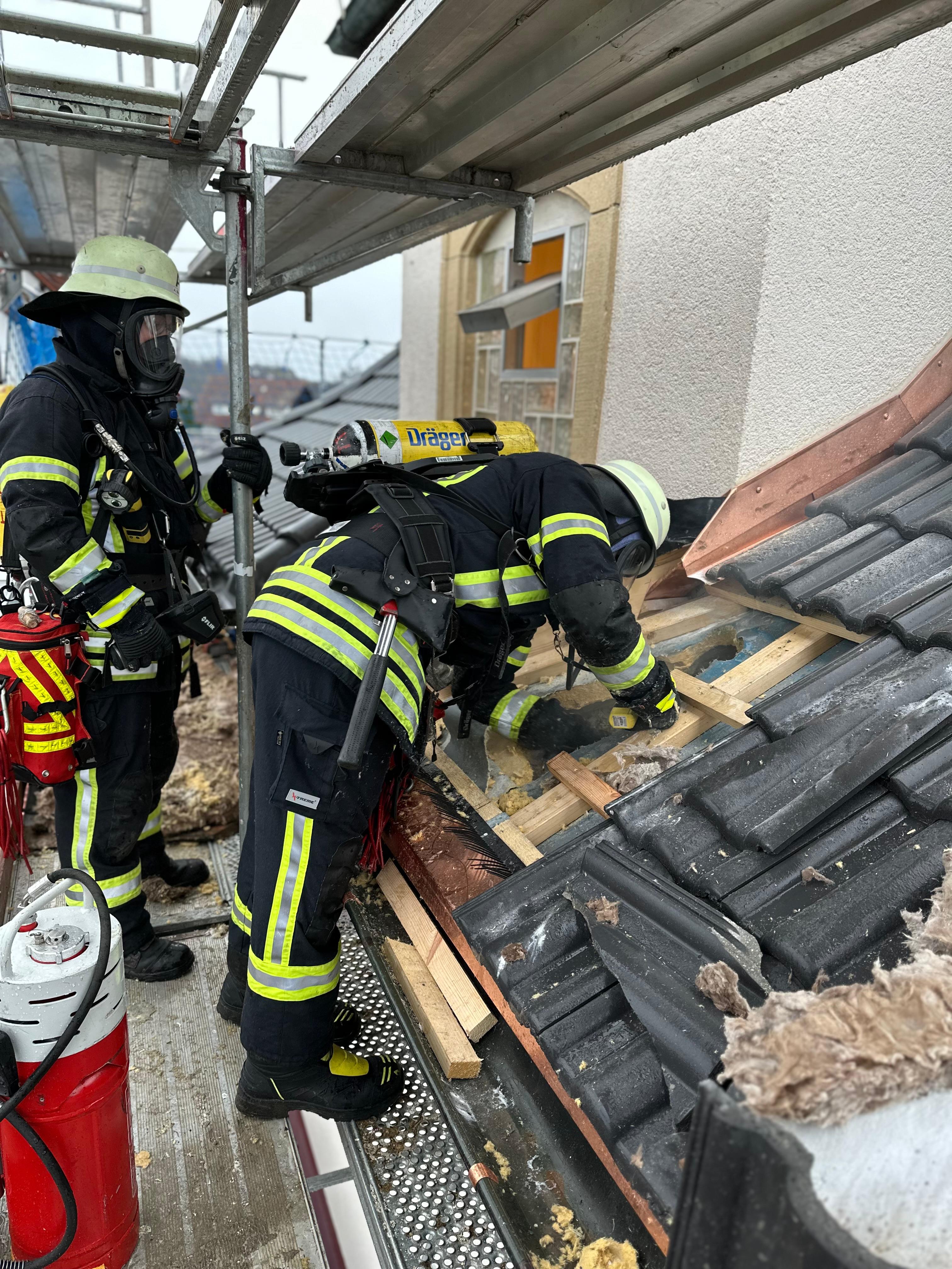 Handwerkern die gerade mit Dacharbeiten an einem eingegrüsteten Mehrfamilienhaus beschäftigt waren, fiel eine Rauchentwirklung im Dachbereich auf und alarmierten über die 112 die Feuerwehr. Erste Löschmaßnahmen mit einem Pulverlöscher durch die Handwerker zeigten keine Wirkung.
