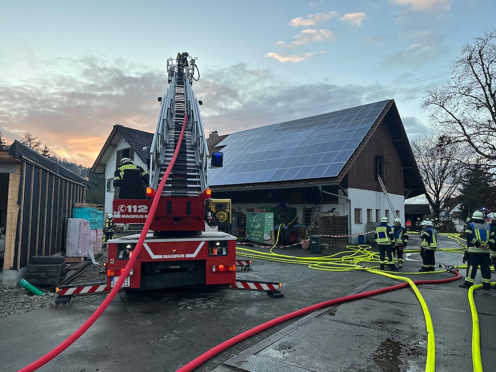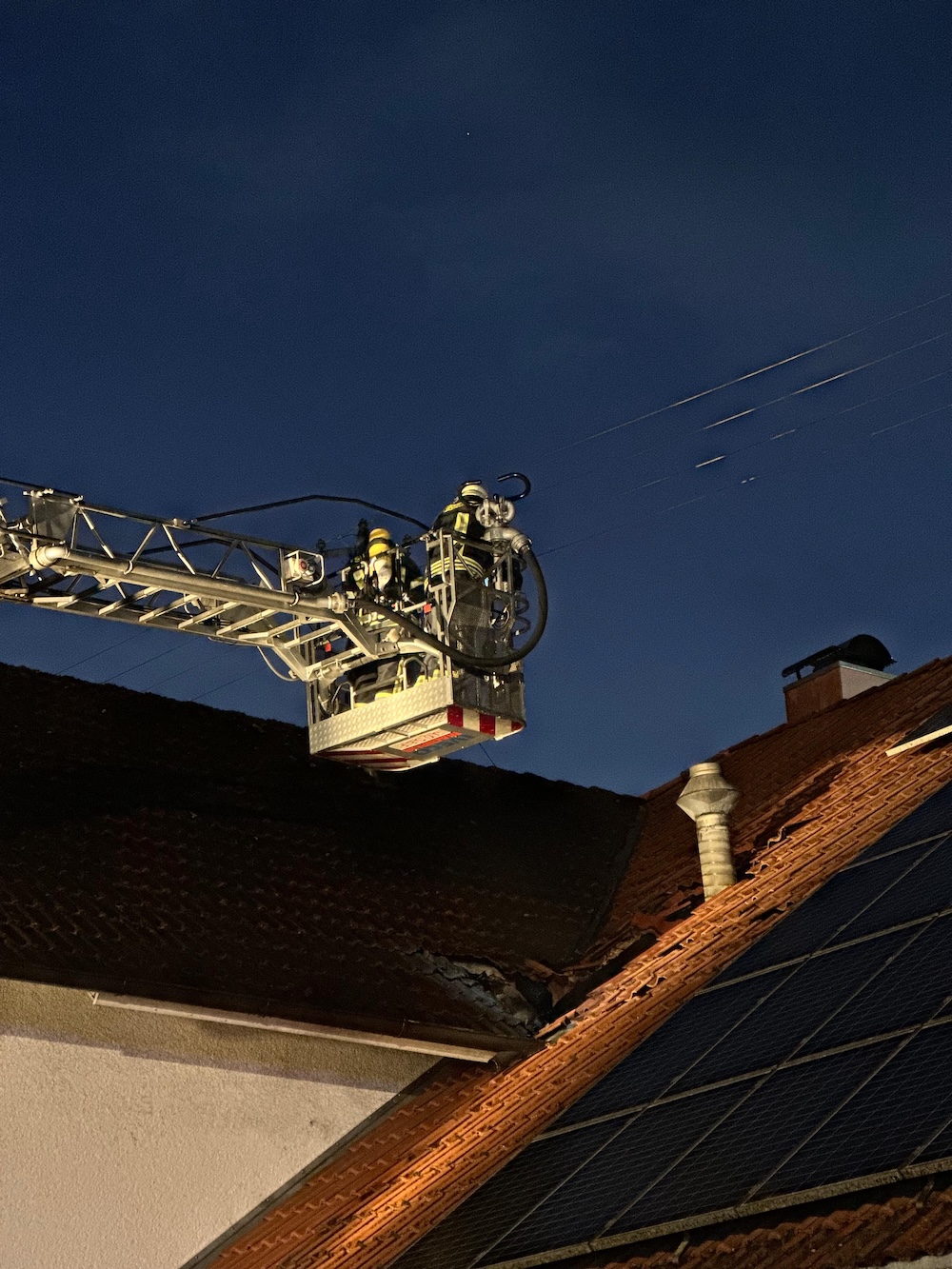 Aufwendig musste von zwei Drehleitern aus die Dachhaut im Bereich des Dachfirstes geöffnet und gezielte Löschmaßnahmen eingeleitet werden. Noch während des Einsatzes wurde aufgrund der installierten PV-Anlage ein Fachberater zur Einsatzstelle beordert, der die Führungskräfte vor Ort unterstützte und anschließend Abschaltmaßnahmen an der Anlage vornahm.