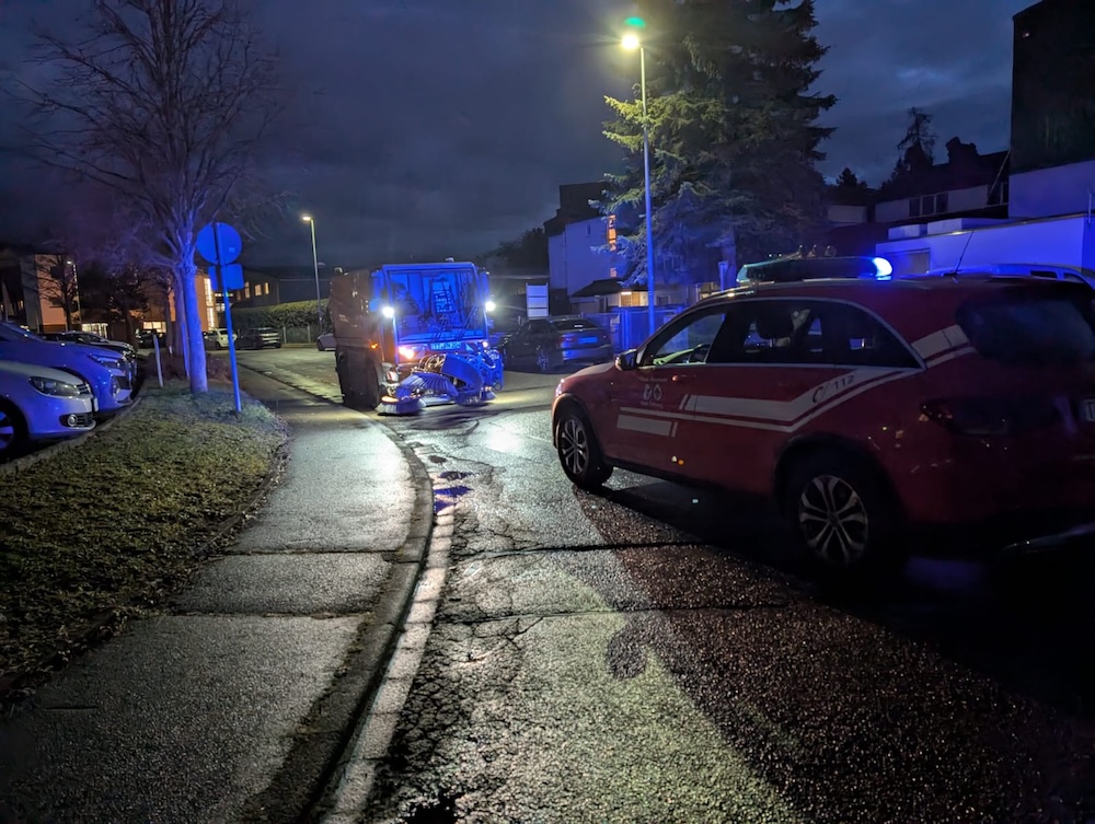 In einem Industriegebiet musste eine Ölspur über die gesamte Fahrbahnbreite von etwa 100 Metern Länge beseitigt werden. Hierzu wurde die Kehrmaschine des städtischen Bauhofs hinzugezogen.