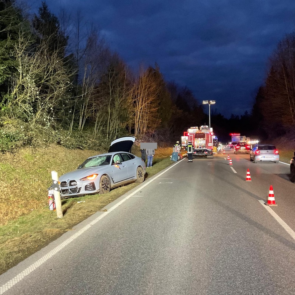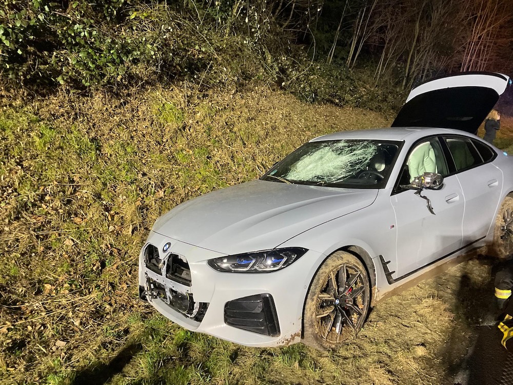 Alleinbeteiligt verunfallte ein BMW auf der B 467. Eine Person wurde dabei leicht verletzt. Die Feuerwehr sicherte die Unfallstelle ab, stellte den Brandschutz sicher und zersägte einen Baum, mit dem das Fahrzeug kollidierte.