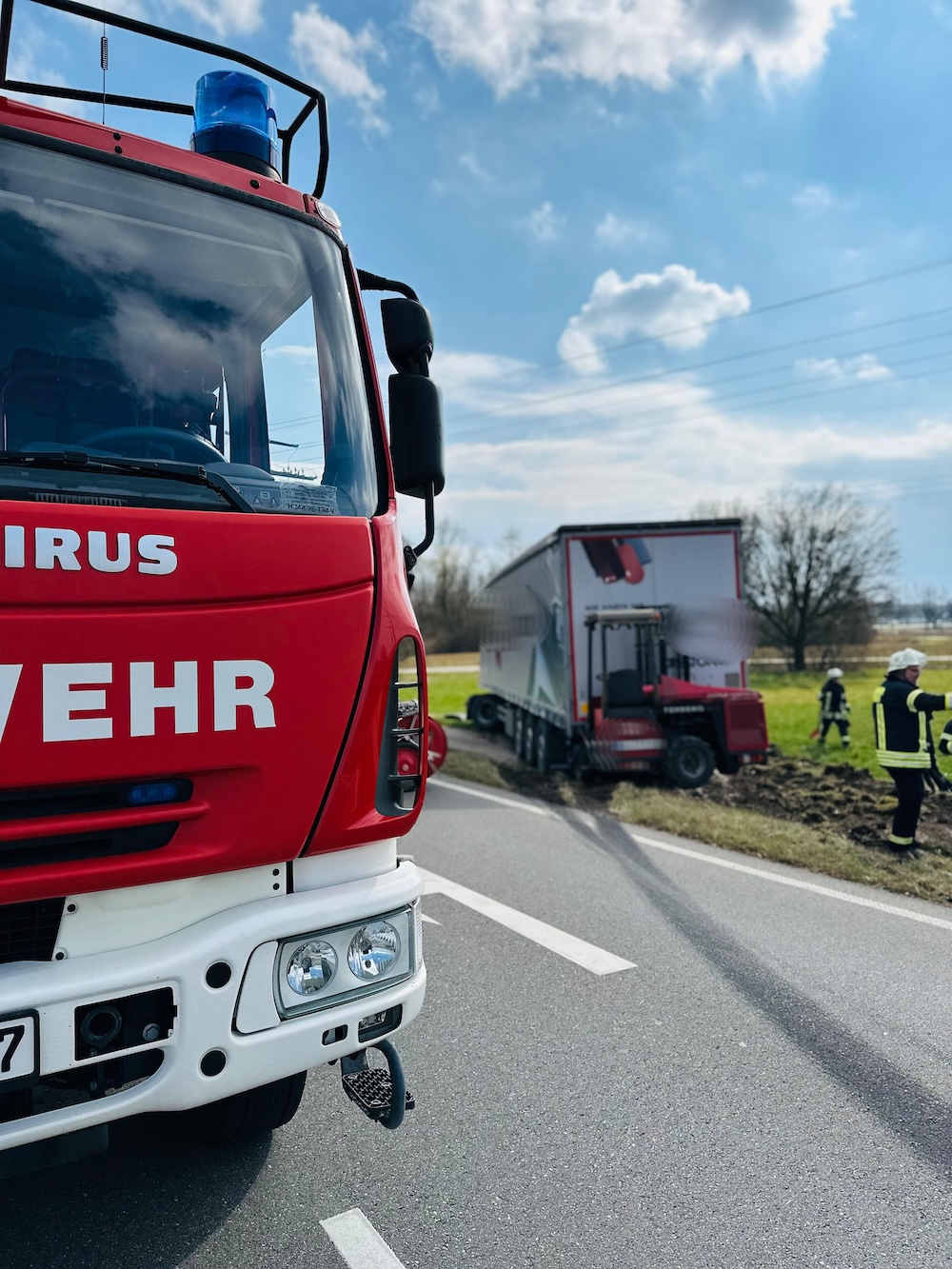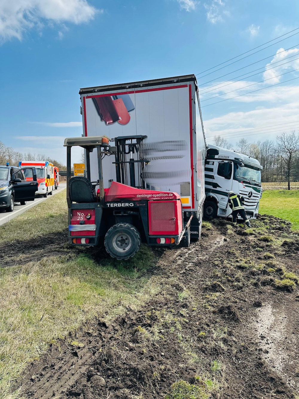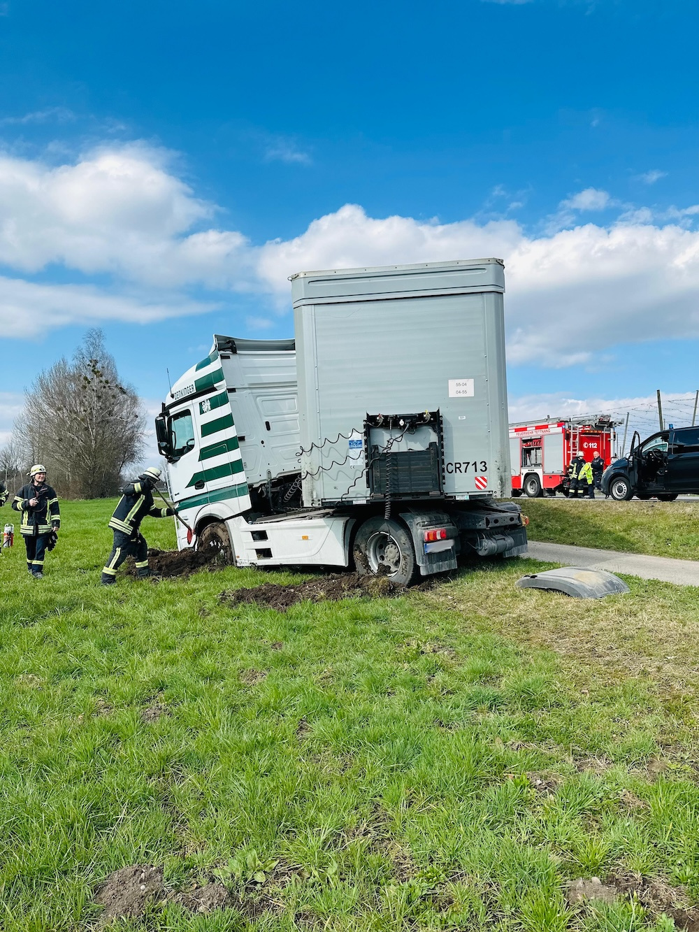 Ein Sattelzug war alleinbeteiligt von Straße abgekommen. Der Fahrer war glücklicherweise augenscheinlich unverletzt. Daraufhin stellte Feuerwehr den Brandschutz und sicherte die Einsatzstelle ab.