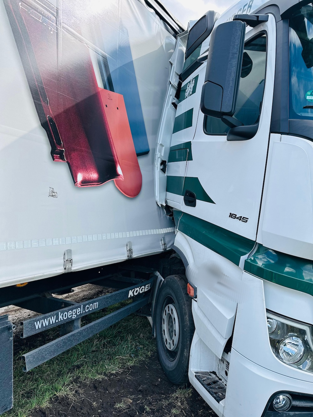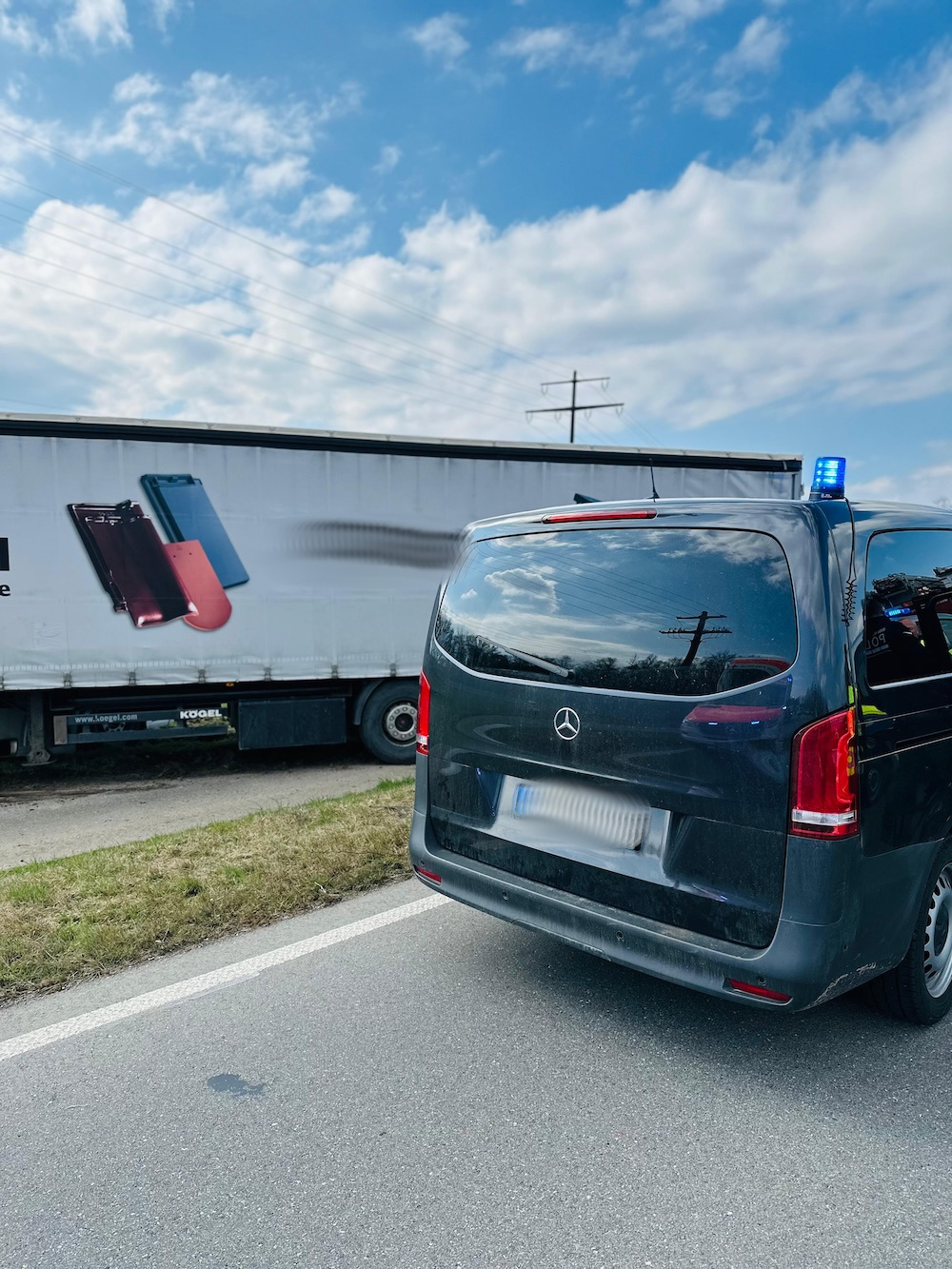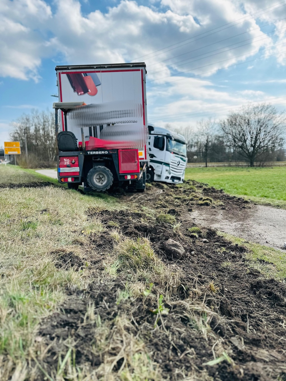 Ein Sattelzug war alleinbeteiligt von Straße abgekommen. Der Fahrer war glücklicherweise augenscheinlich unverletzt. Daraufhin stellte Feuerwehr den Brandschutz und sicherte die Einsatzstelle ab.
