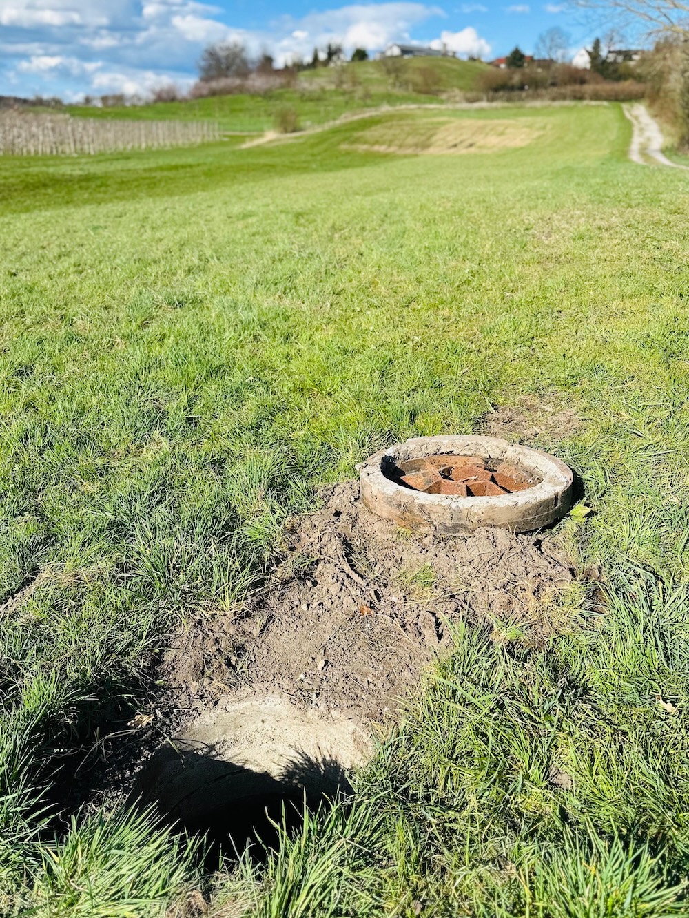 Da der Deckel nicht mehr anzubringen war, wurde der Schacht mit einer Palette und Betongewichten gesichert.