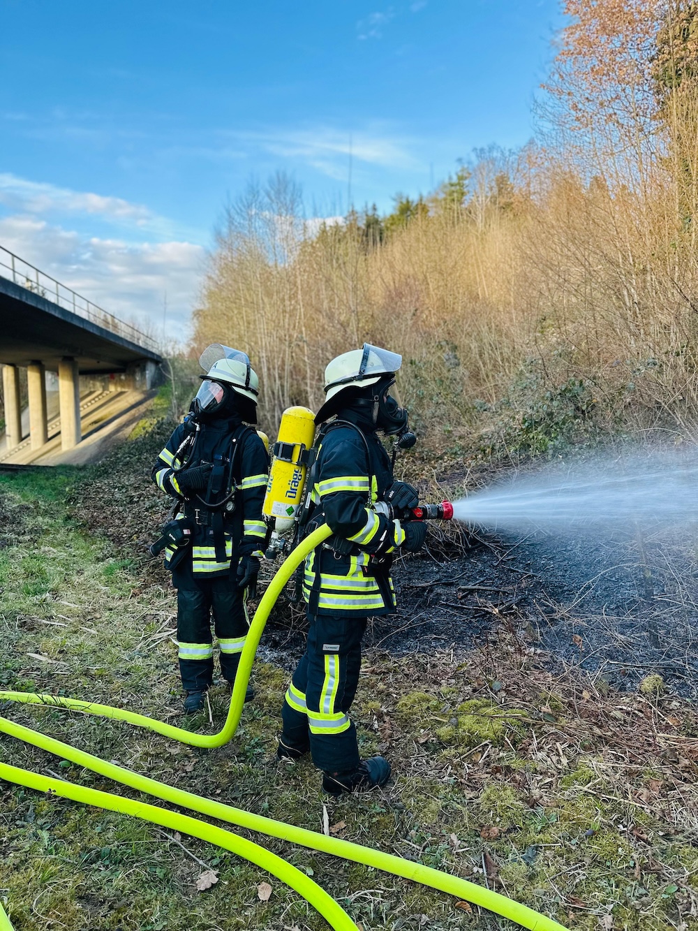 An der alten Bahntrasse von Tettnang nach Meckenbeuren brannte die Vegetation im Bereich der B 467. Mit einem C-Rohr löschte ein Trupp unter Atemschutz das Feuer und verhinderte somit die weitere Brandausbreitung.