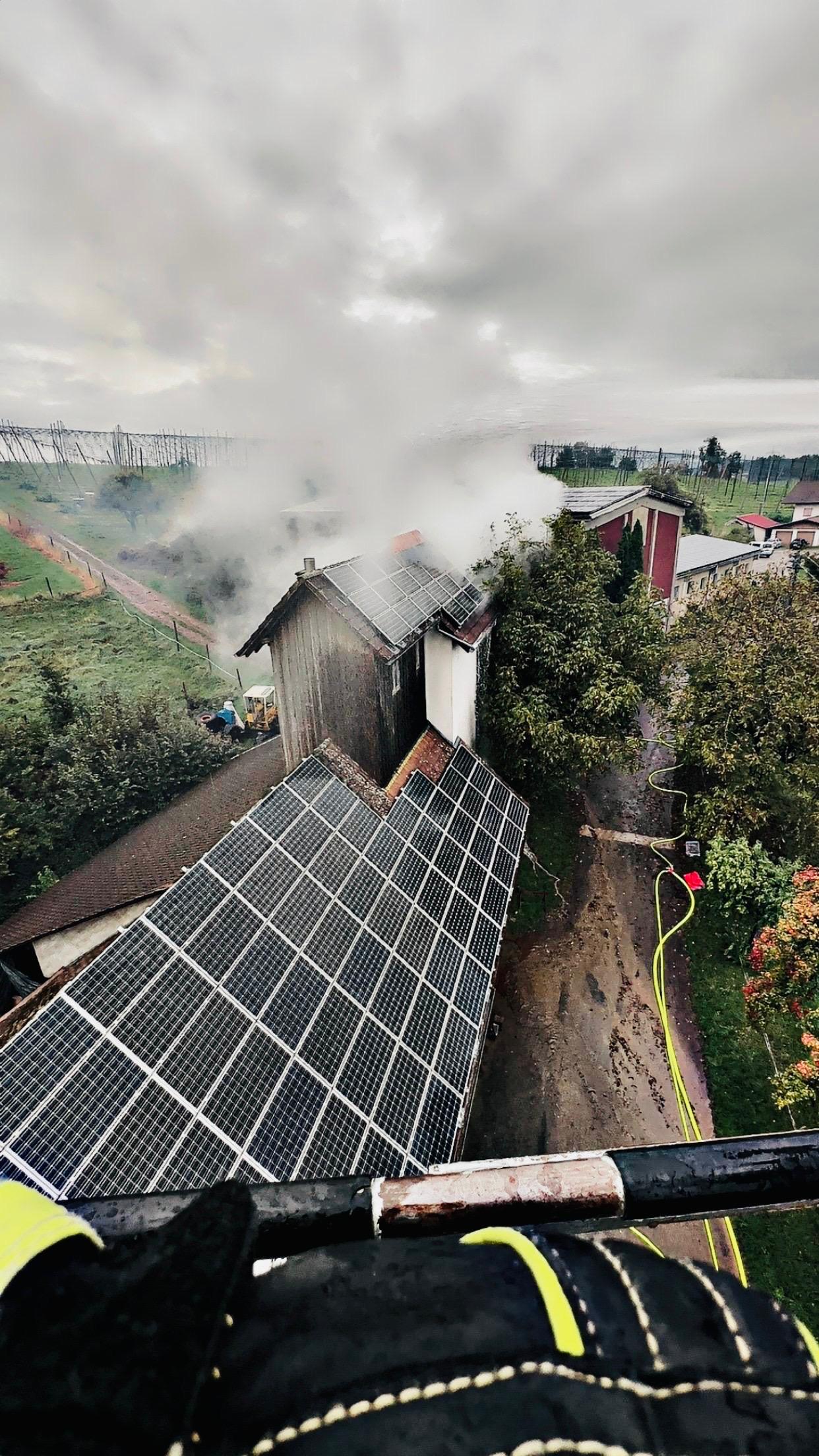 Mittels Innenangriff über Löschrohre und mit Wenderohr über die Drehleiter wurde der Brand im Hopfenturm des Anwesens unter Kontrolle gebracht.