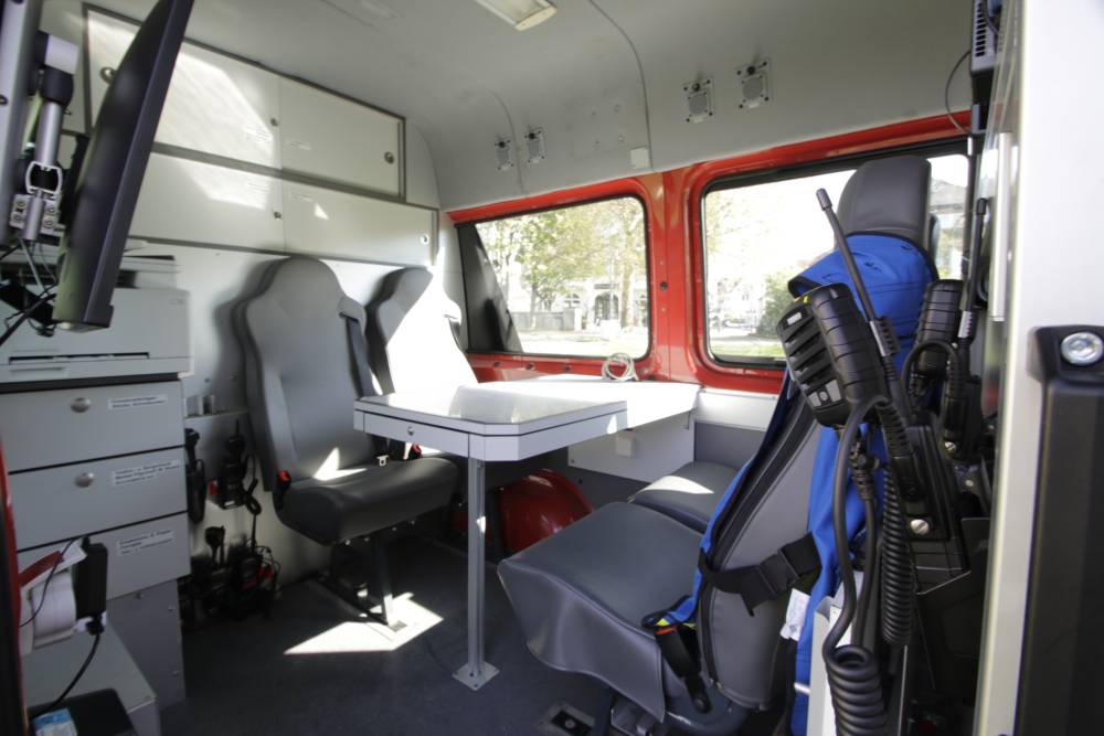 Der Besprechungsraum selbst bietet Platz für vier Personen. Hier befindet sich ein Tisch, Einsatzunterlagen, Gasspürgeräte, Laptop, ein Multifunktionsgerät zum Drucken, Faxen, Scannen und Kopieren, Handfunkgeräte für das 2m-Band und zwei Mobilteile für die eigene Telefonanlage. Durch Lautsprecher kann zu jeder Zeit der Funkverkehr im Besprechungsraum mitgehört werden. Im Heck des ELW 1 ist die Wärmebildkamera, ein Stromaggregat, Funktionswesten, Verbandsrucksack, Handlampen, ein Highpress-Löscher und Pylonen verstaut. Um möglichst überall eine Funkverbindung gewährleisten zu können, befindet sich im Heck eine ausfahrbare Funkantenne mit einer aufsetzbaren roten Rundumkennleuchte, die die Einsatzleitung kennzeichnet. Vor Witterung schützt eine Markise, die bei Bedarf ausgefahren werden kann. Bei Dunkelheit kann die Umfeldbeleuchtung aktiviert werden.