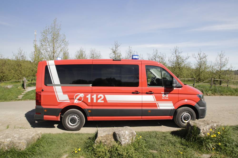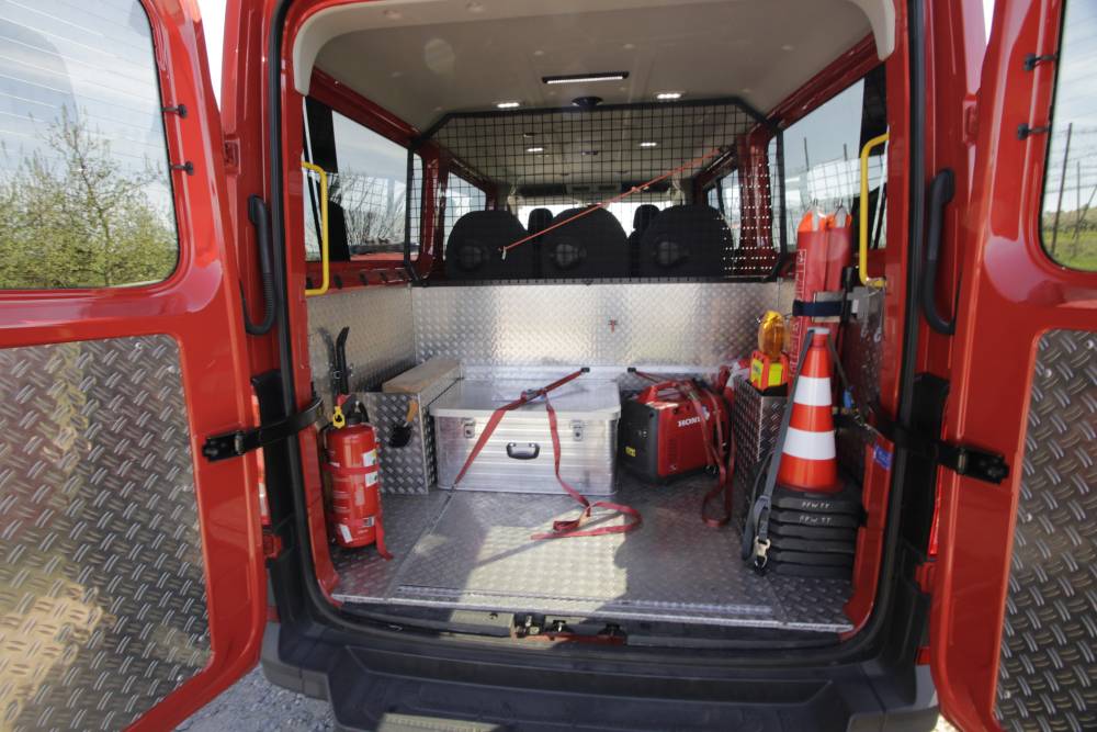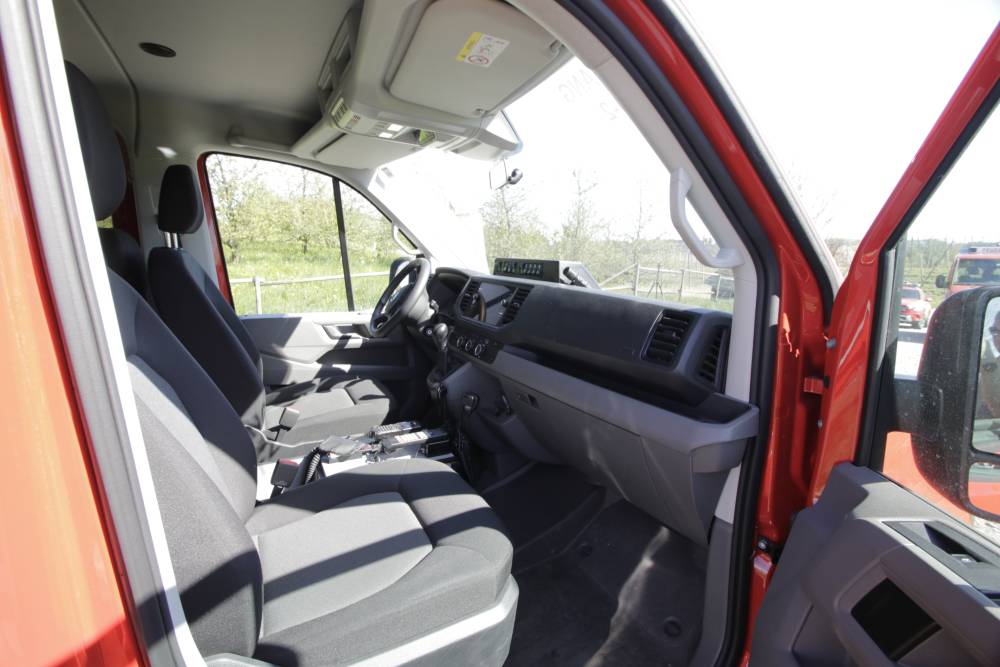 Der VW Crafter mit 8 Sitzplätzen ist mit einer Standheizung, Automatikgetriebe, Navigationssystem und Rückfahrkamera ausgestattet. Bei Dunkelheit sorgt die Umfeldbeleuchtung für bessere Sicht. Das Fahrzeug wird zum Transport von Mannschaft und kleineren Materialien bei Einsätzen, Übungen und Diensten verwendet.