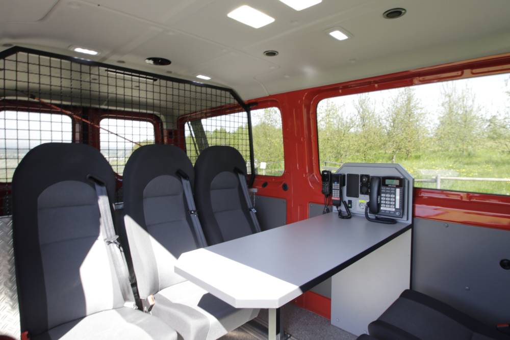 Mit der eingebauten Führungsausstattung (Schreibtisch mit 4m-Funkgerät und Telefon) kann der MTW auch für kleinere Lagen oder beispielsweise Wachdienste zur Dokumentation und Koordination genutzt werden.