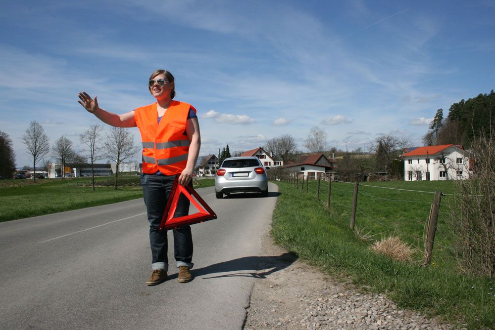 - Ziehen Sie eine Warnweste an, steigen Sie aus und nehmen Sie das Warndreieck aus Ihrem Fahrzeug.